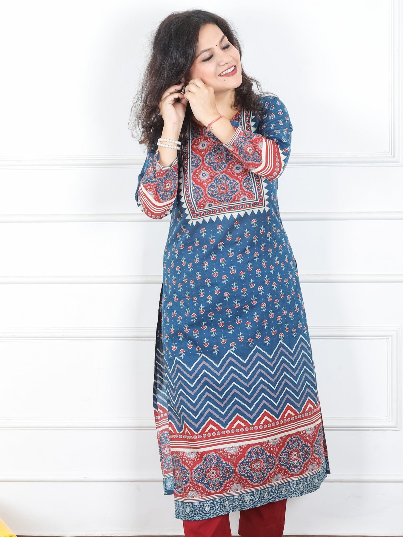 Description- Step into elegance with this muslin printed kurti, designed with a striking geometric pattern at the base and intricate ethnic block-style motifs on the yoke, hemline, and sleeves. The straight-cut silhouette is enhanced with side slits for comfort, while the contrast red bottom adds a vibrant touch. Perfect for casual outings or office wear, this kurti blends traditional prints with a modern chic appeal.
