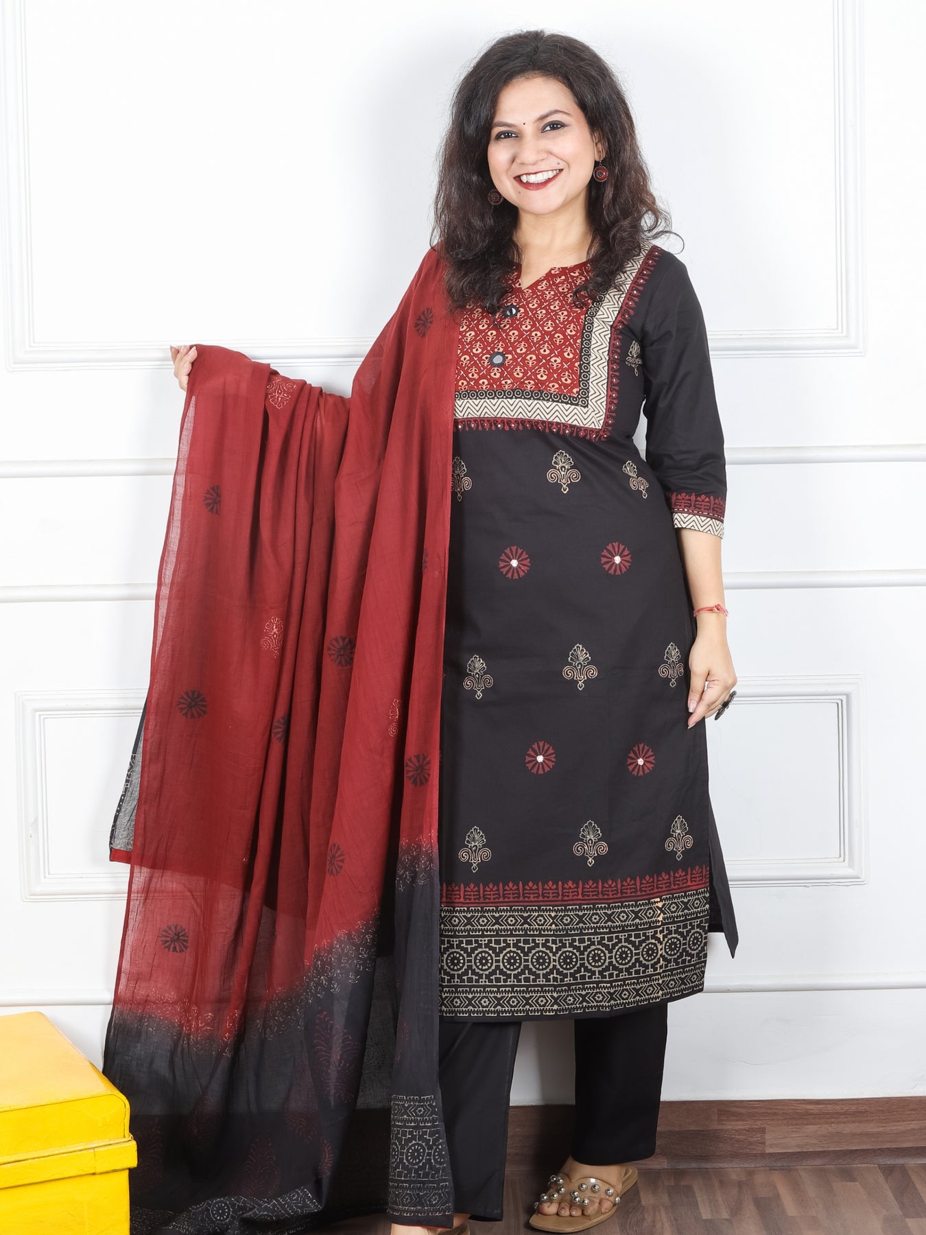 WORK- Exude timeless elegance with this black cotton kurti set, featuring intricate block-inspired prints in earthy red and beige tones. The kurti is adorned with a contrasting embroidered yoke panel in red, highlighted with geometric and floral motifs that add richness to the look.Paired with solid black cotton bottoms and a dual-toned printed dupatta in deep red and black, this ensemble perfectly balances tradition with contemporary wearability.