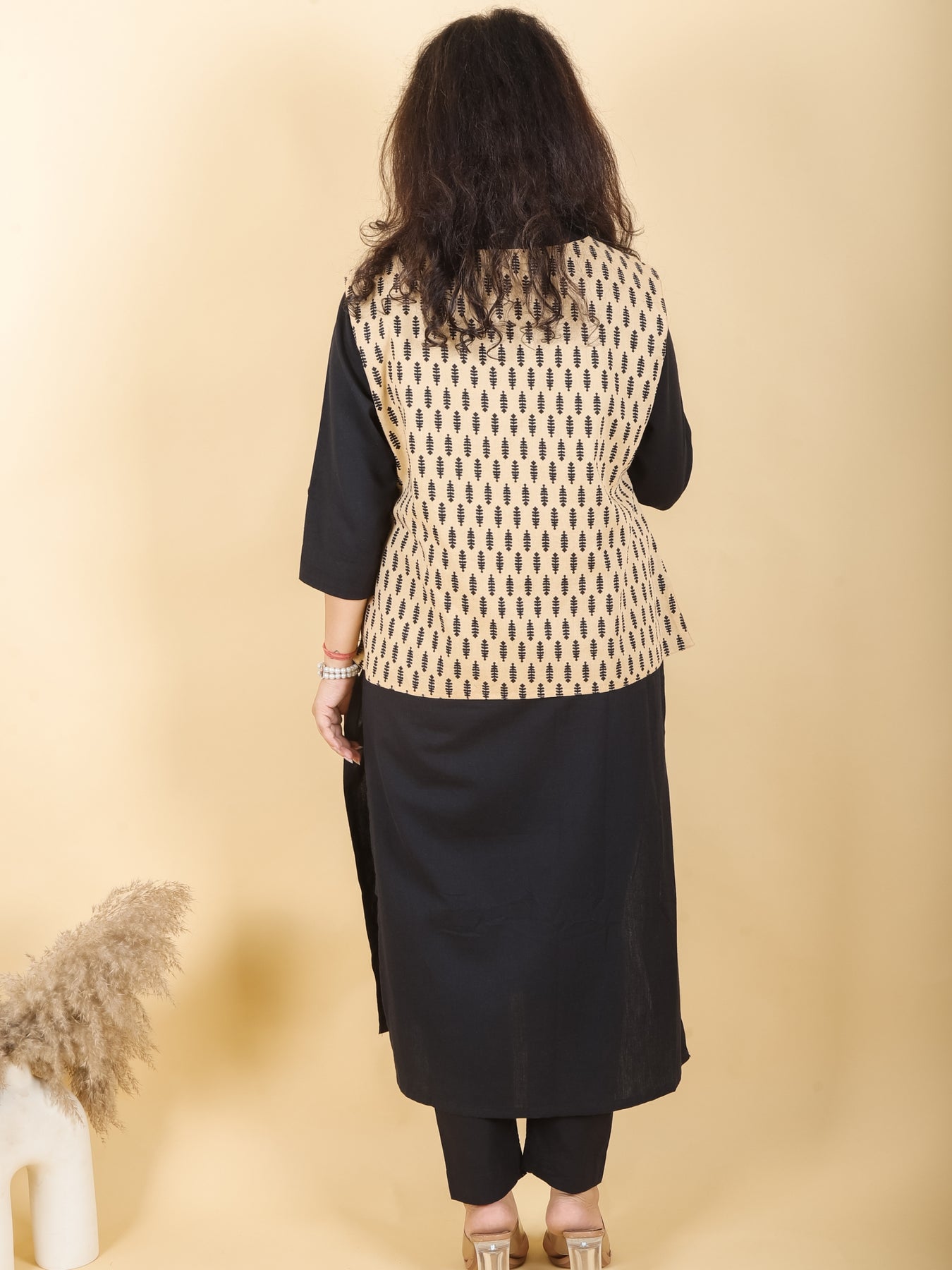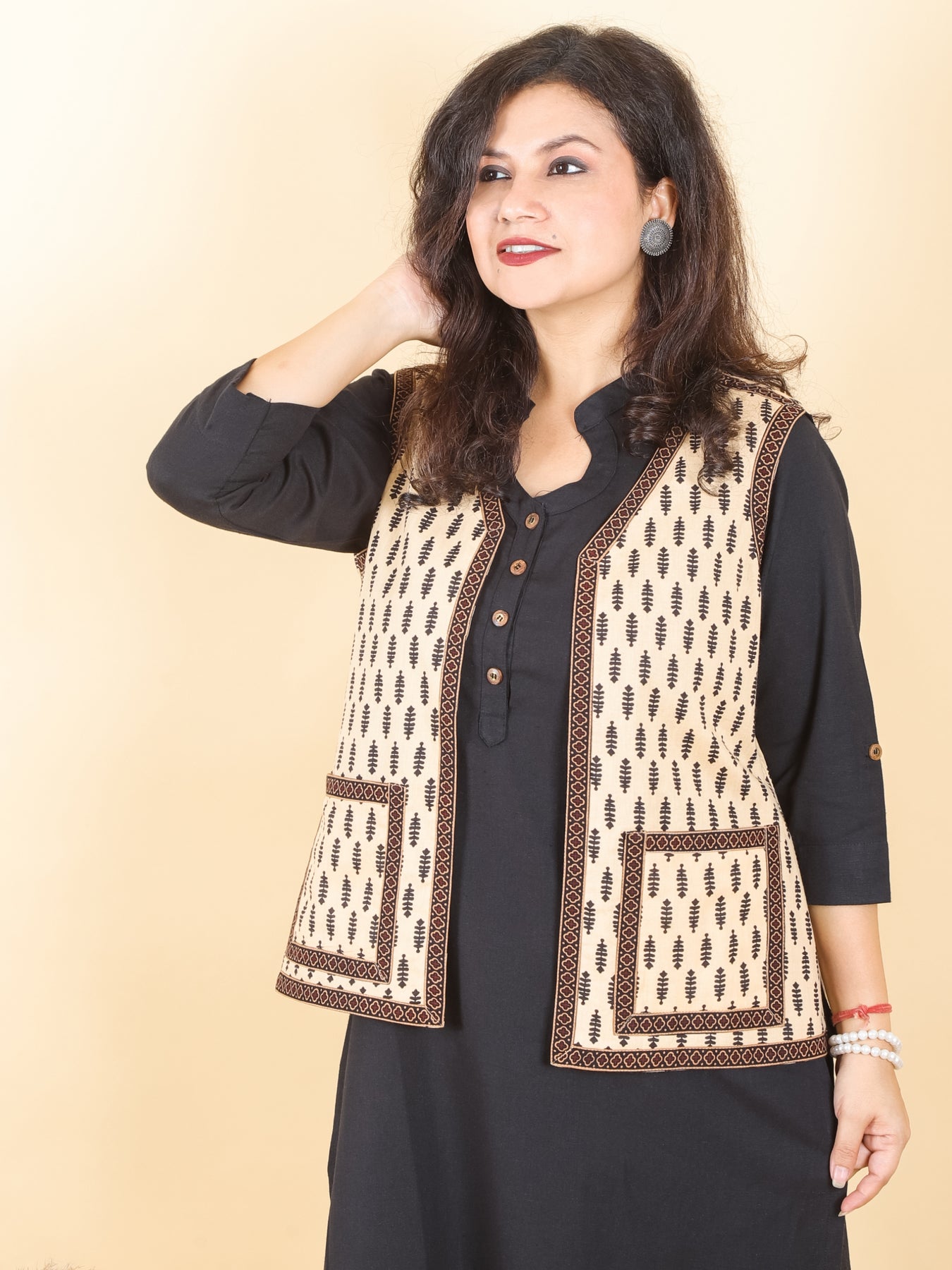 Sejal Beige with Black Printed Cotton Jacket with Pocket
