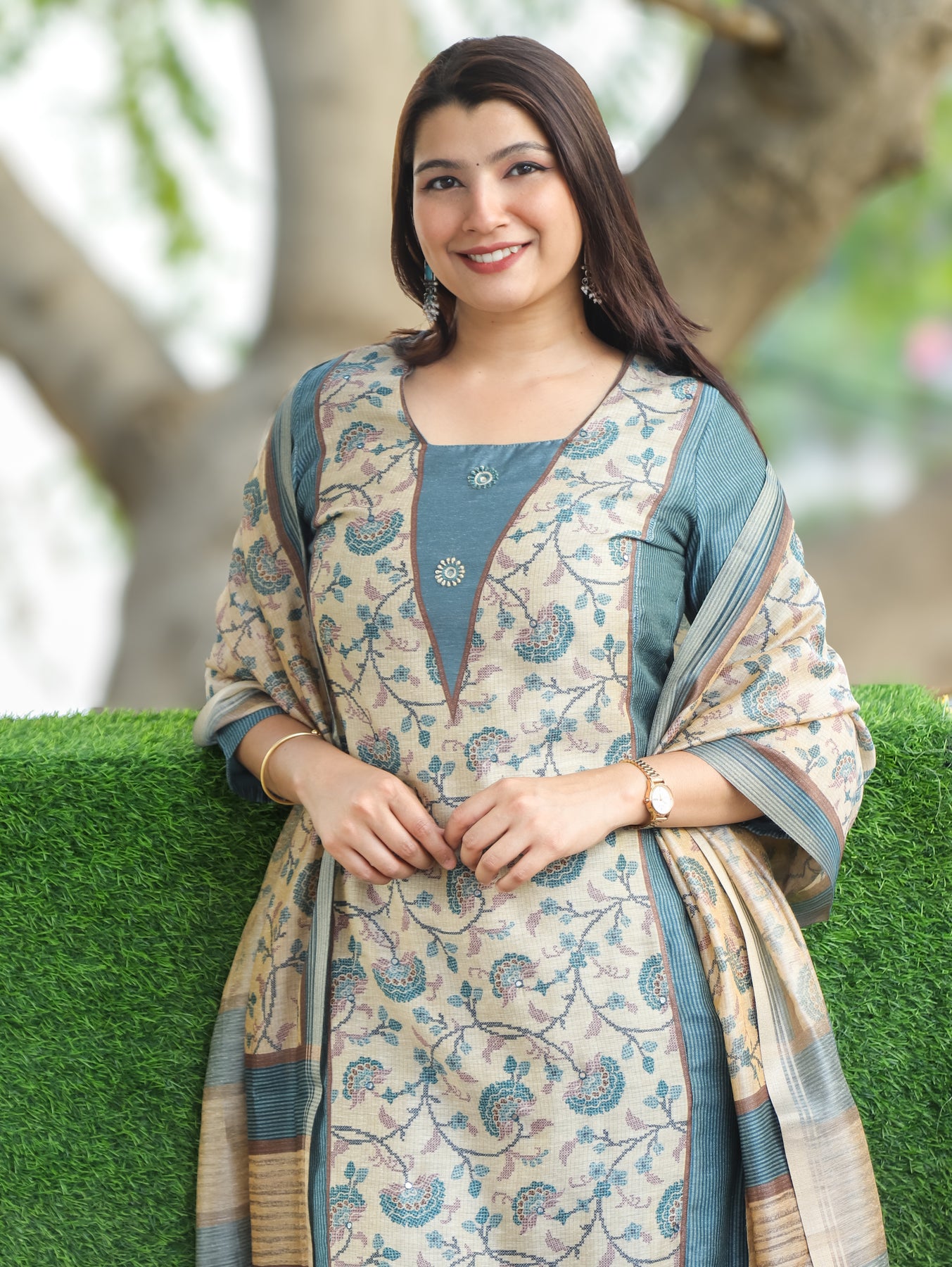 Clara Steel Blue Panel Tussar Chanderi 3 Piece Set