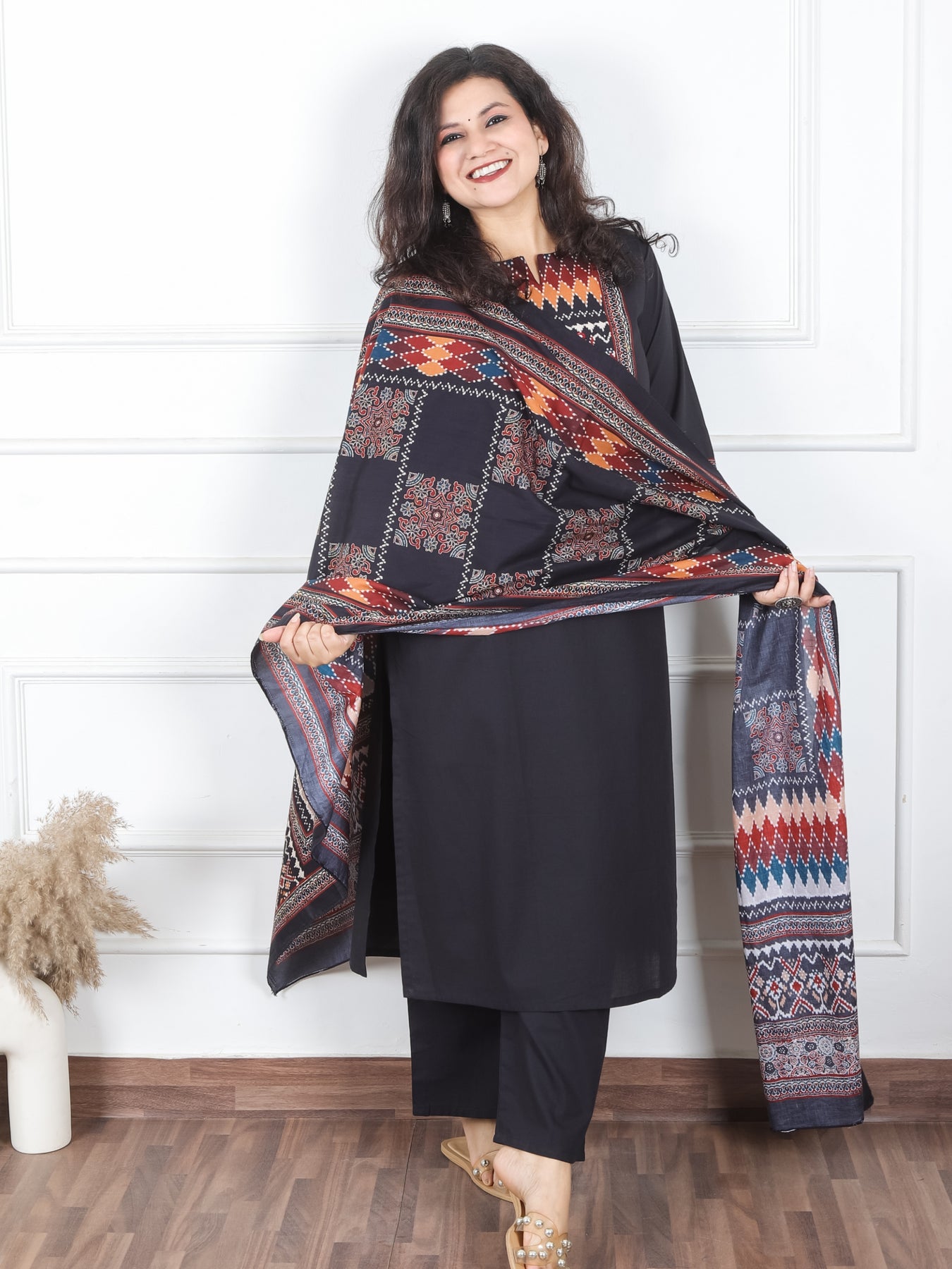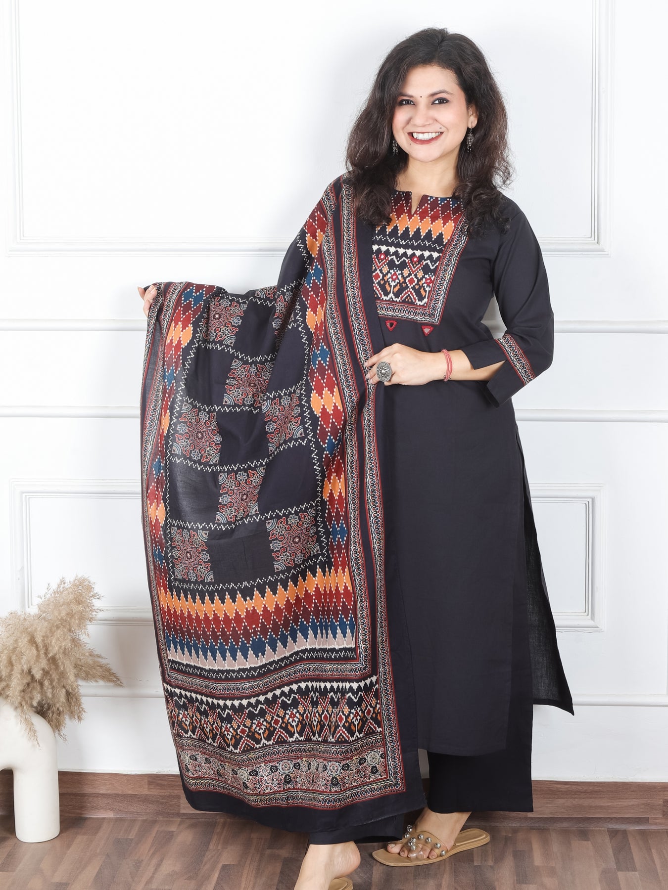 Khusboo Faded Black Printed Patch with Mirror Work in Cotton 3 Piece Set