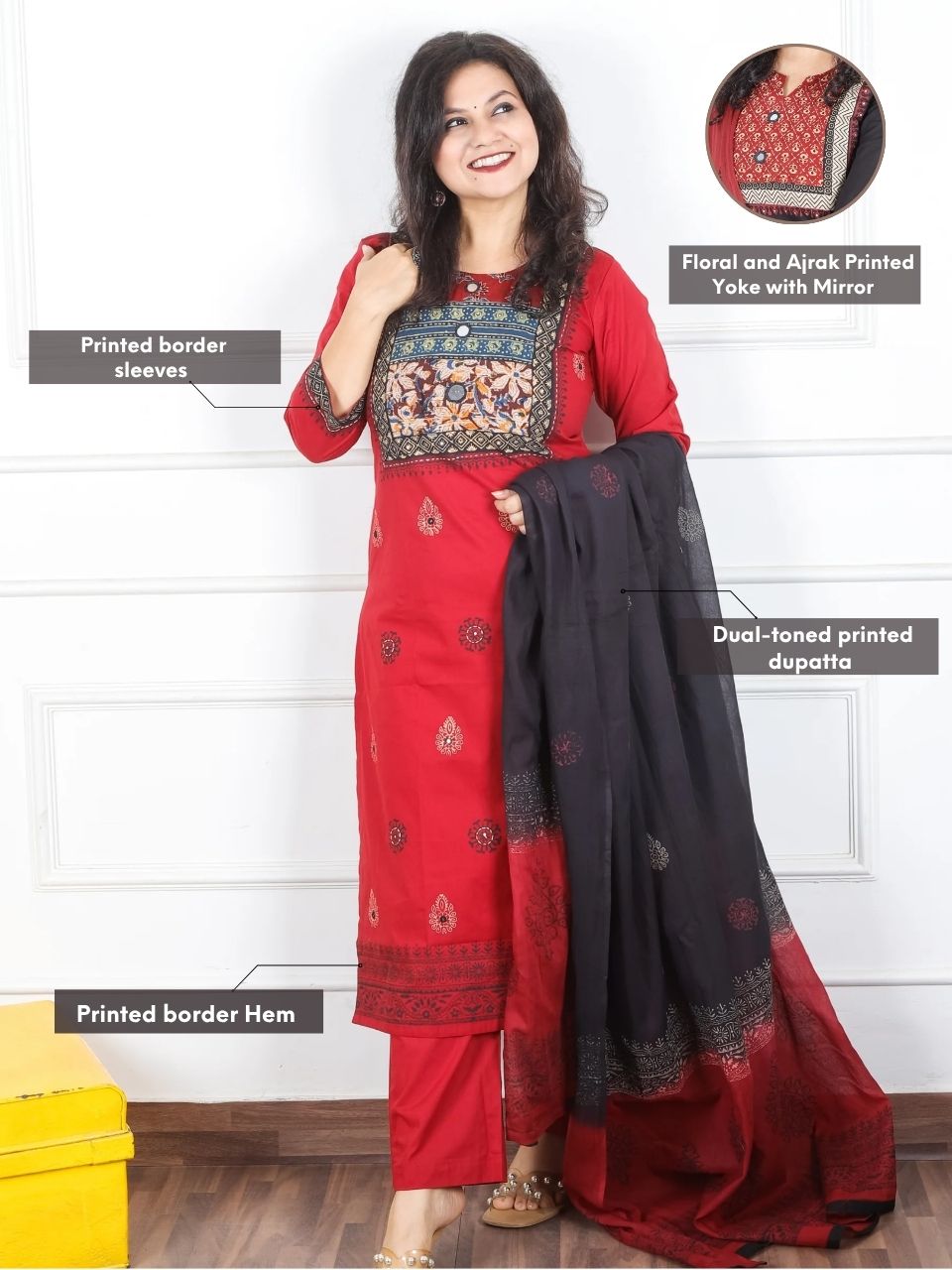 Radhika Berry Red Floral and Ajrak Printed Yoke with Mirror Work Cotton 3 Piece Set