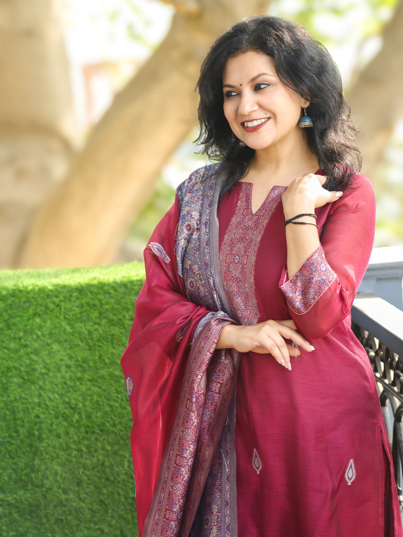 Rupali Mocha Wine Round Neck in Jamdani Kashmiri Inspired Chanderi 3 Piece Set