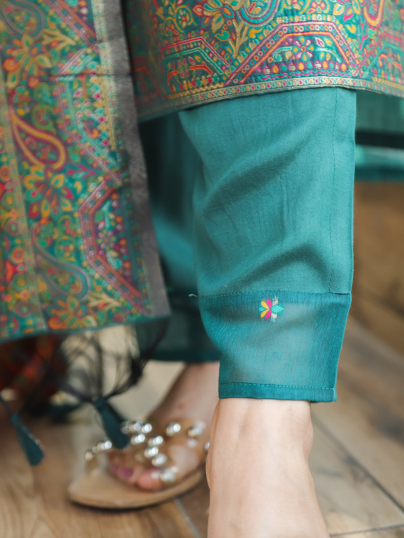 Saheli Emerald Green Round Neck in Jamdani Kashmiri Inspired Chanderi 3 Piece Set