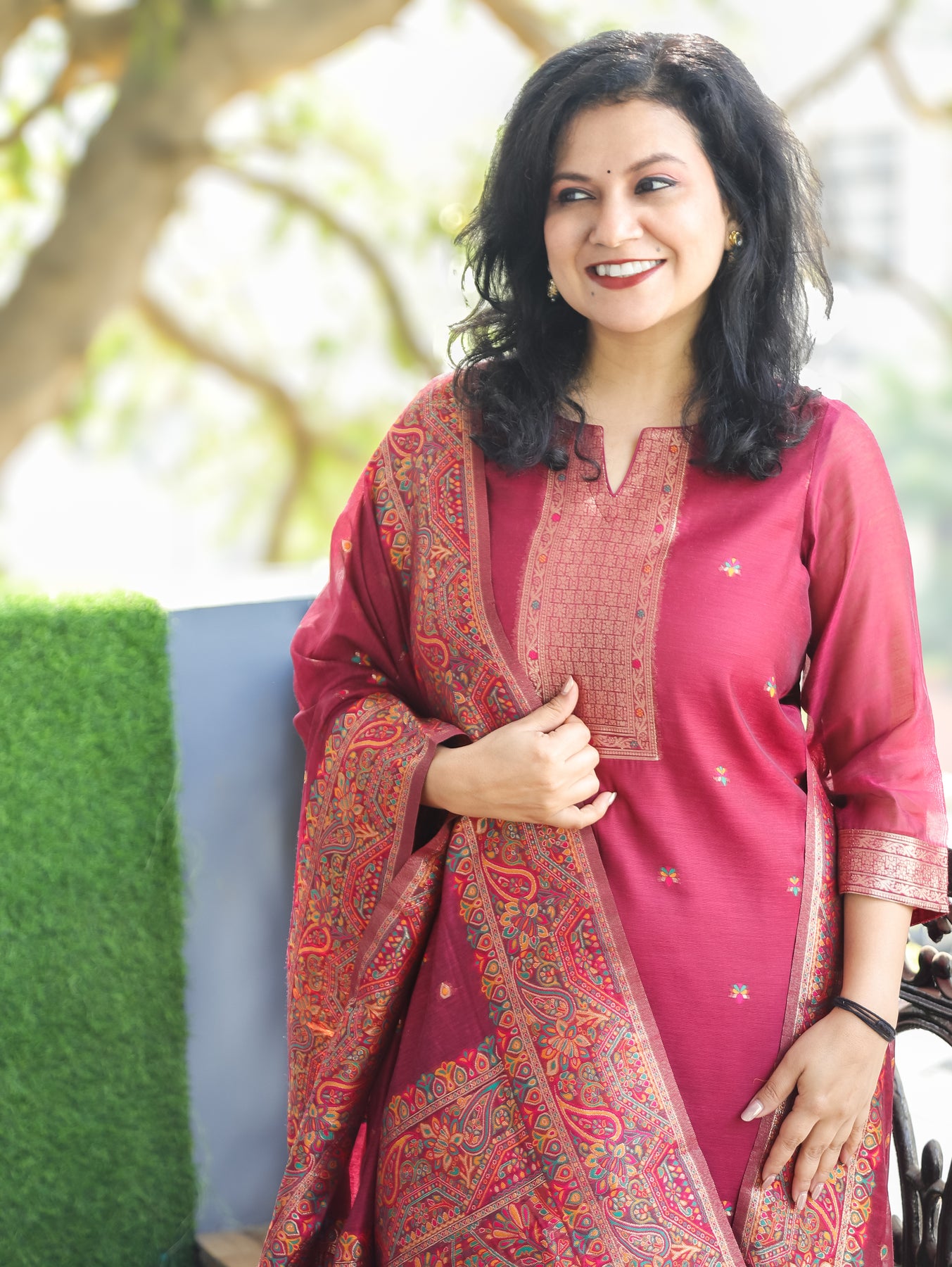 Saheli Cranberry Magenta Round Neck in Jamdani Kashmiri Inspired Chanderi 3 Piece Set