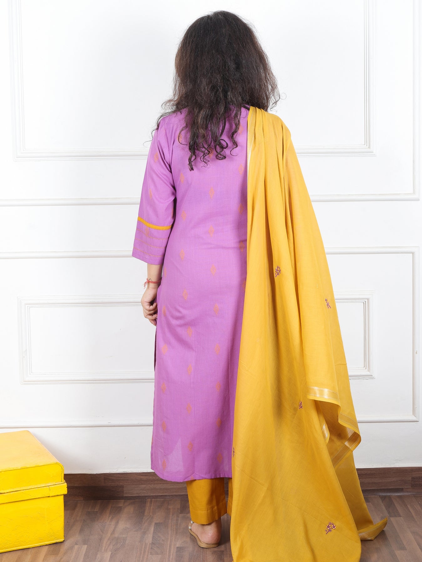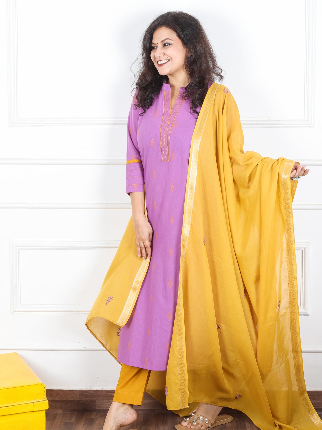 Mishti Lilly Lilac Ban Collar with Running Stitch Work South Cotton 3 Piece Set