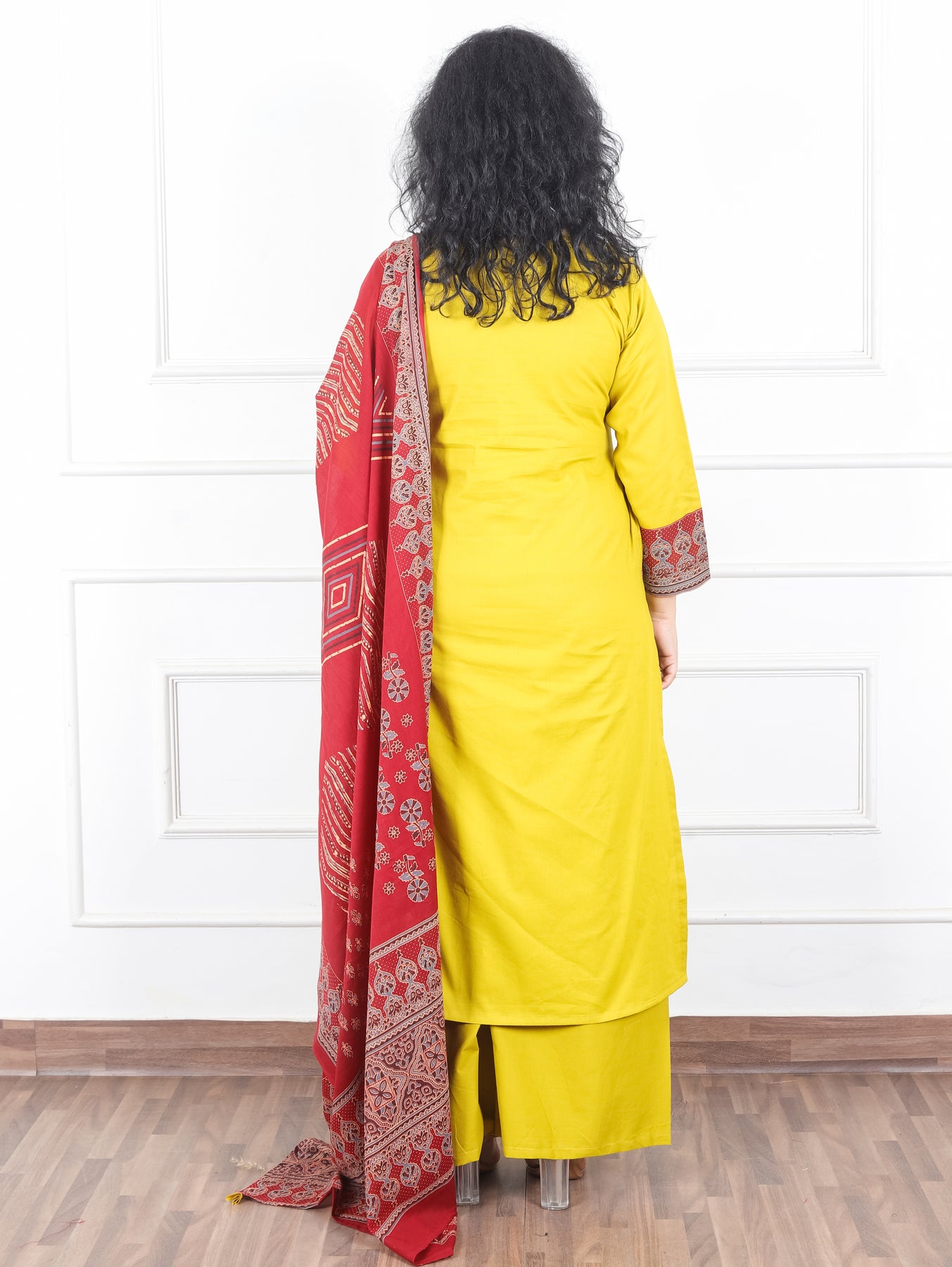 Swaroop Bright Yellow Ajrak Patch with Shell Work Panel Cotton 3 Piece Set with Pocket