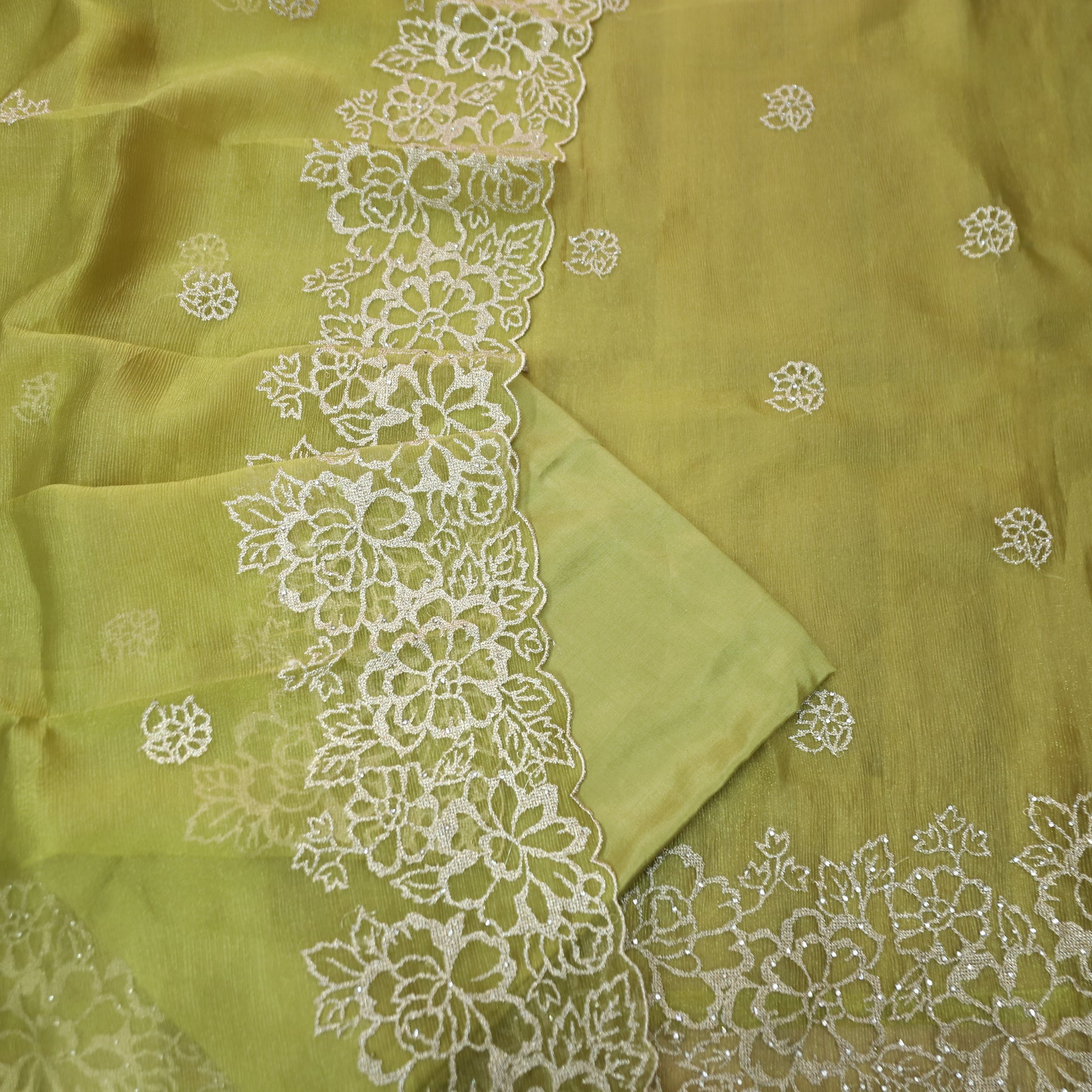 Description- An elegant crinkle organza suit set featuring intricate zari and stone embellishments in a delicate cut work style. The ensemble is paired with a matching crinkle organza dupatta, beautifully designed with coordinated embroidery and finished with a cut work hem for a graceful look. A sophisticated choice for festive and special occasions..