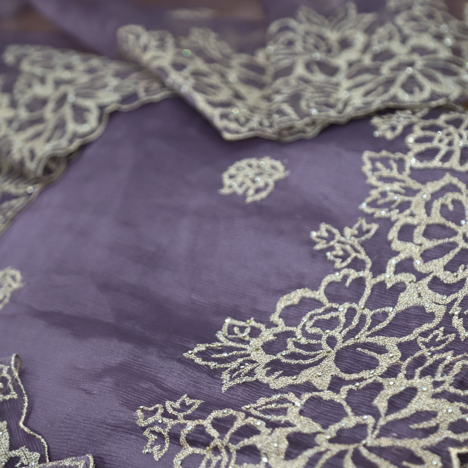 Description- An elegant crinkle organza suit set featuring intricate zari and stone embellishments in a delicate cut work style. The ensemble is paired with a matching crinkle organza dupatta, beautifully designed with coordinated embroidery and finished with a cut work hem for a graceful look. A sophisticated choice for festive and special occasions..