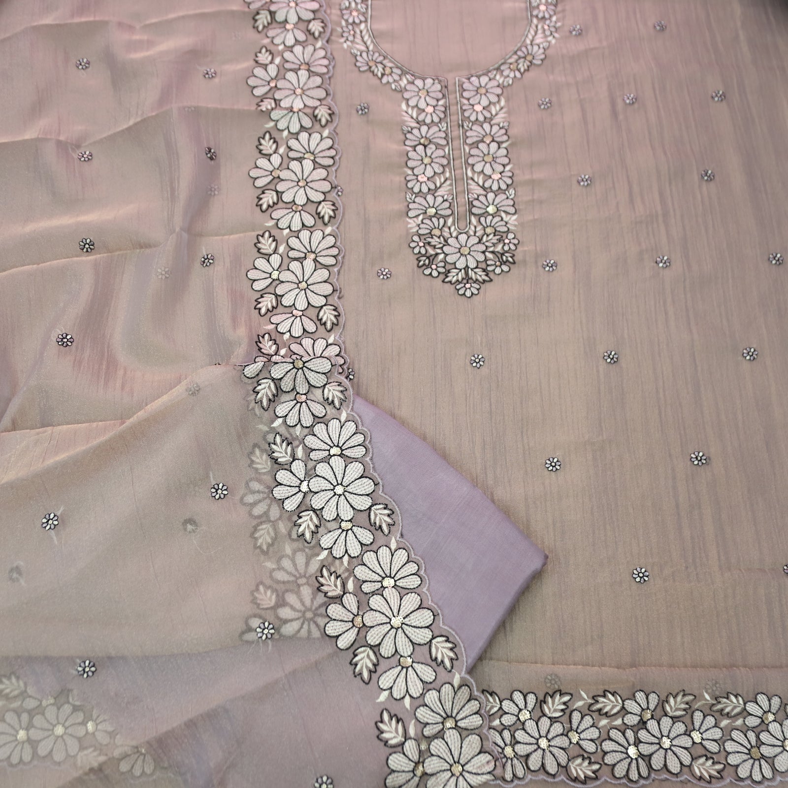 Description- An elegant shimmer tissue organza suit set featuring a delicately embroidered top with fine thread work. The dupatta is crafted in matching shimmer tissue organza, highlighted with exquisite cutwork and intricate embroidery along the hem, adding a luxurious charm. Perfect for festive occasions and evening celebrations, this ensemble beautifully balances subtle sheen with intricate craftsmanship..