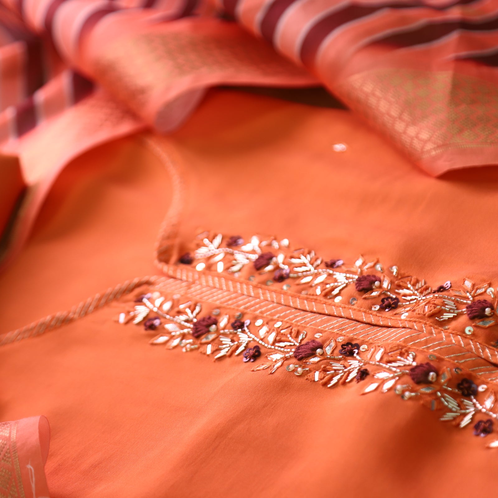 Maya Peach Orange Kardana Embellish Neck Work in Modal Suit Set