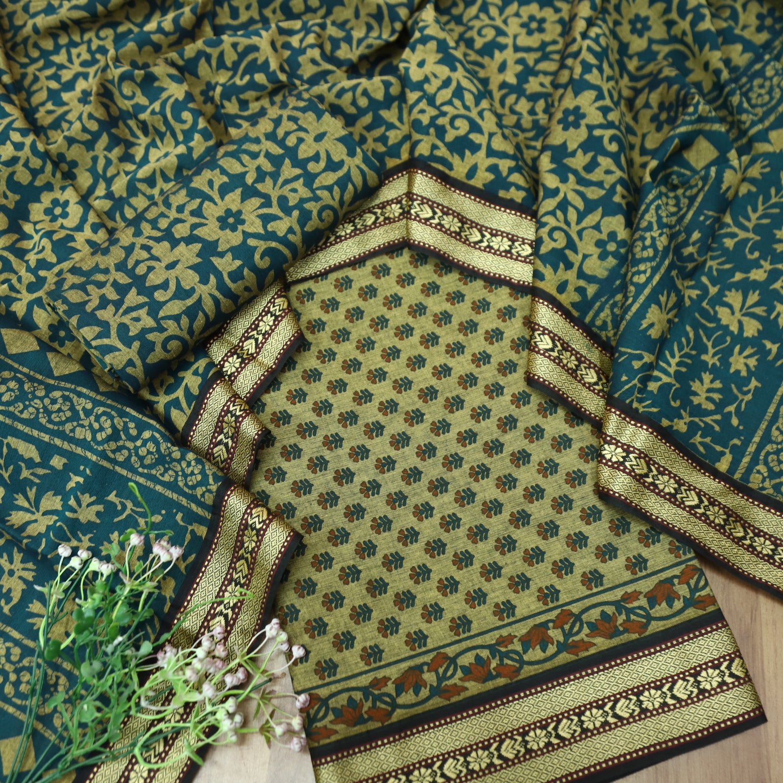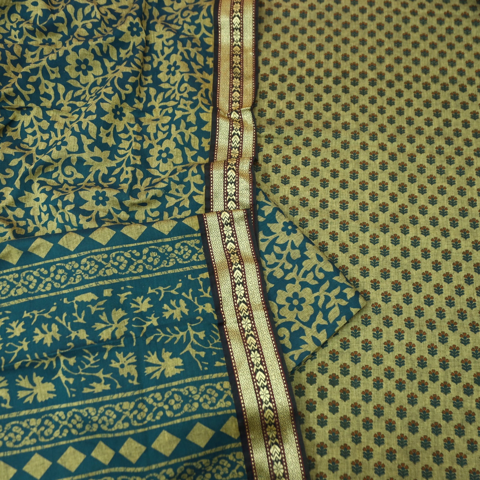 Raavi Beige with Teal Digital Printed with Mangalgiri Work on Hem Cotton Suit Set