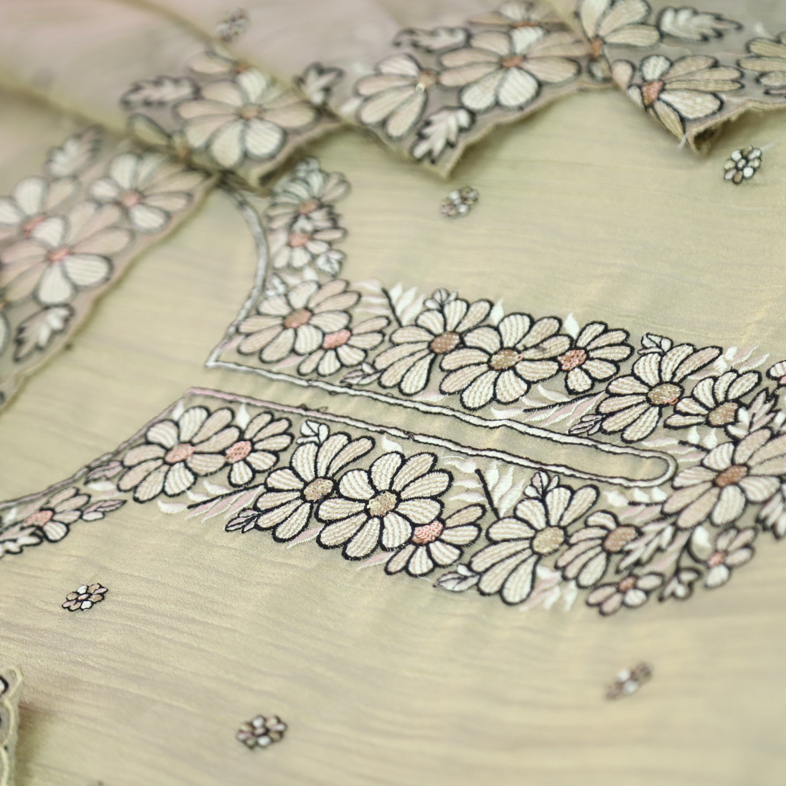 Description- An elegant shimmer tissue organza suit set featuring a delicately embroidered top with fine thread work. The dupatta is crafted in matching shimmer tissue organza, highlighted with exquisite cutwork and intricate embroidery along the hem, adding a luxurious charm. Perfect for festive occasions and evening celebrations, this ensemble beautifully balances subtle sheen with intricate craftsmanship..