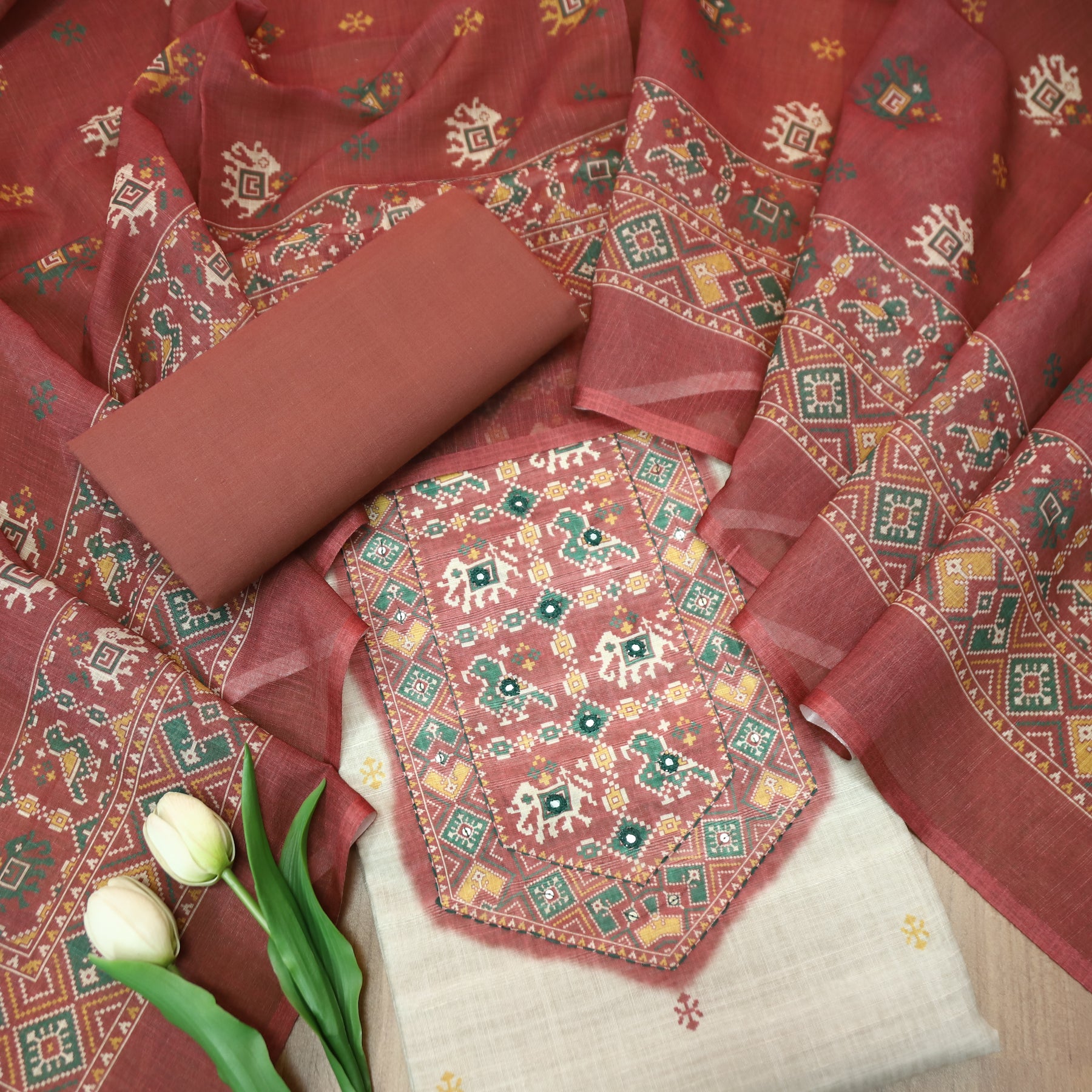 Description - This elegant cotton linen top features rich Patola prints highlighted on the yoke and hem with refined patra detailing. Paired with a beautifully coordinated Patola printed cotton linen dupatta, this ensemble brings together traditional motifs and contemporary comfort—perfect for effortless ethnic styling.