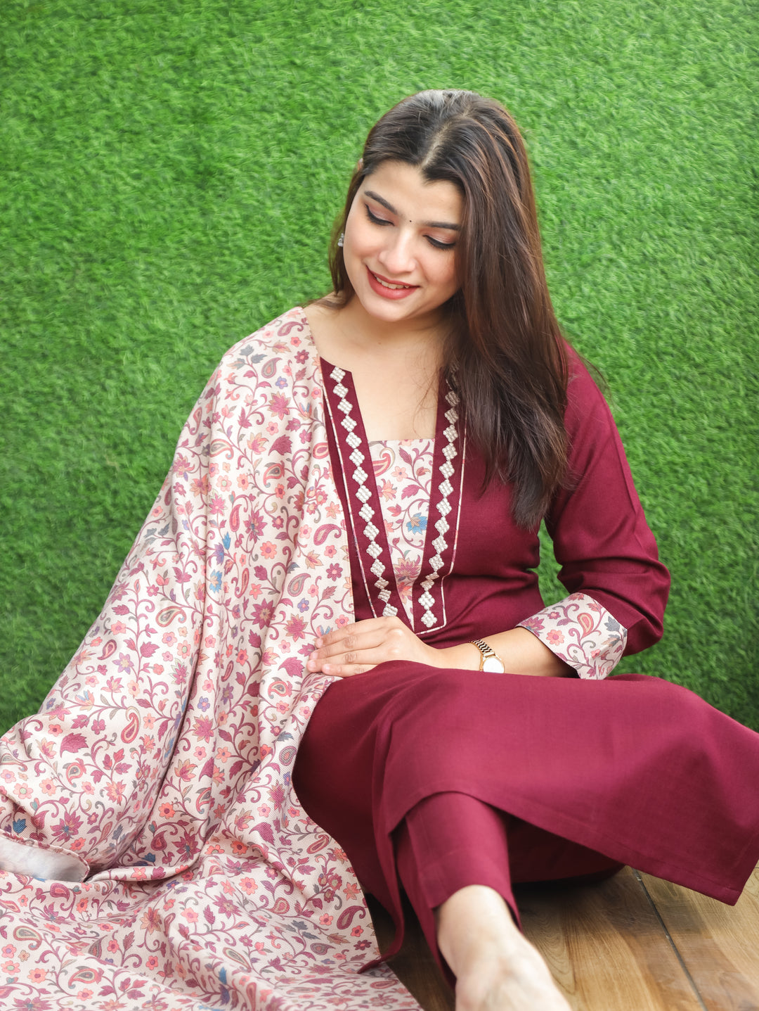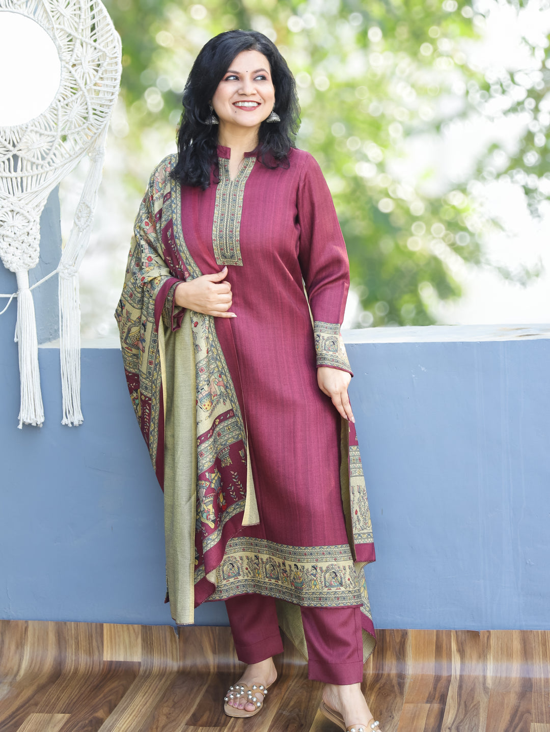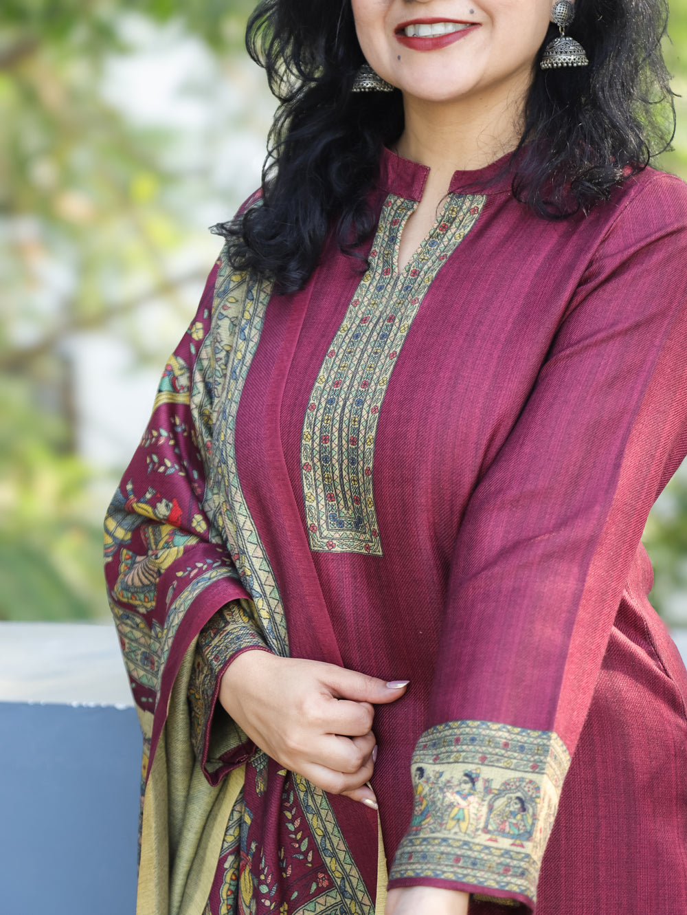 Tarang Maroon Wine Potli Button Work in Kanni Patch Neck Semi Pashmina Winter Kurti