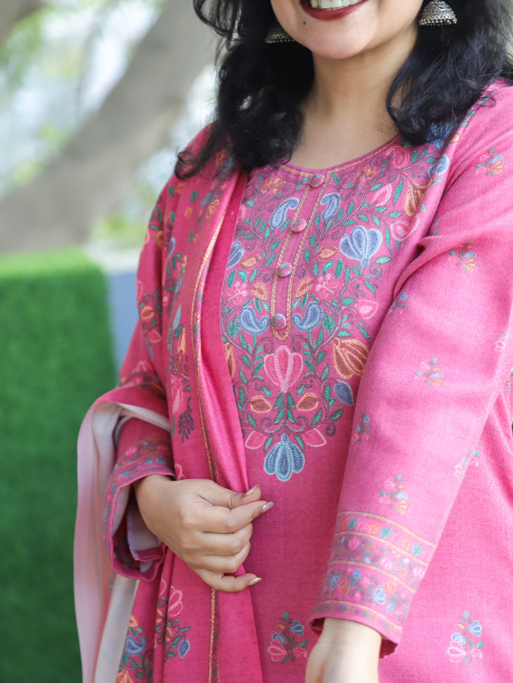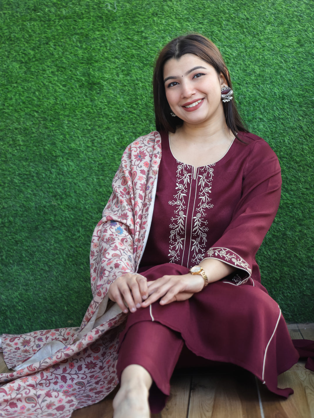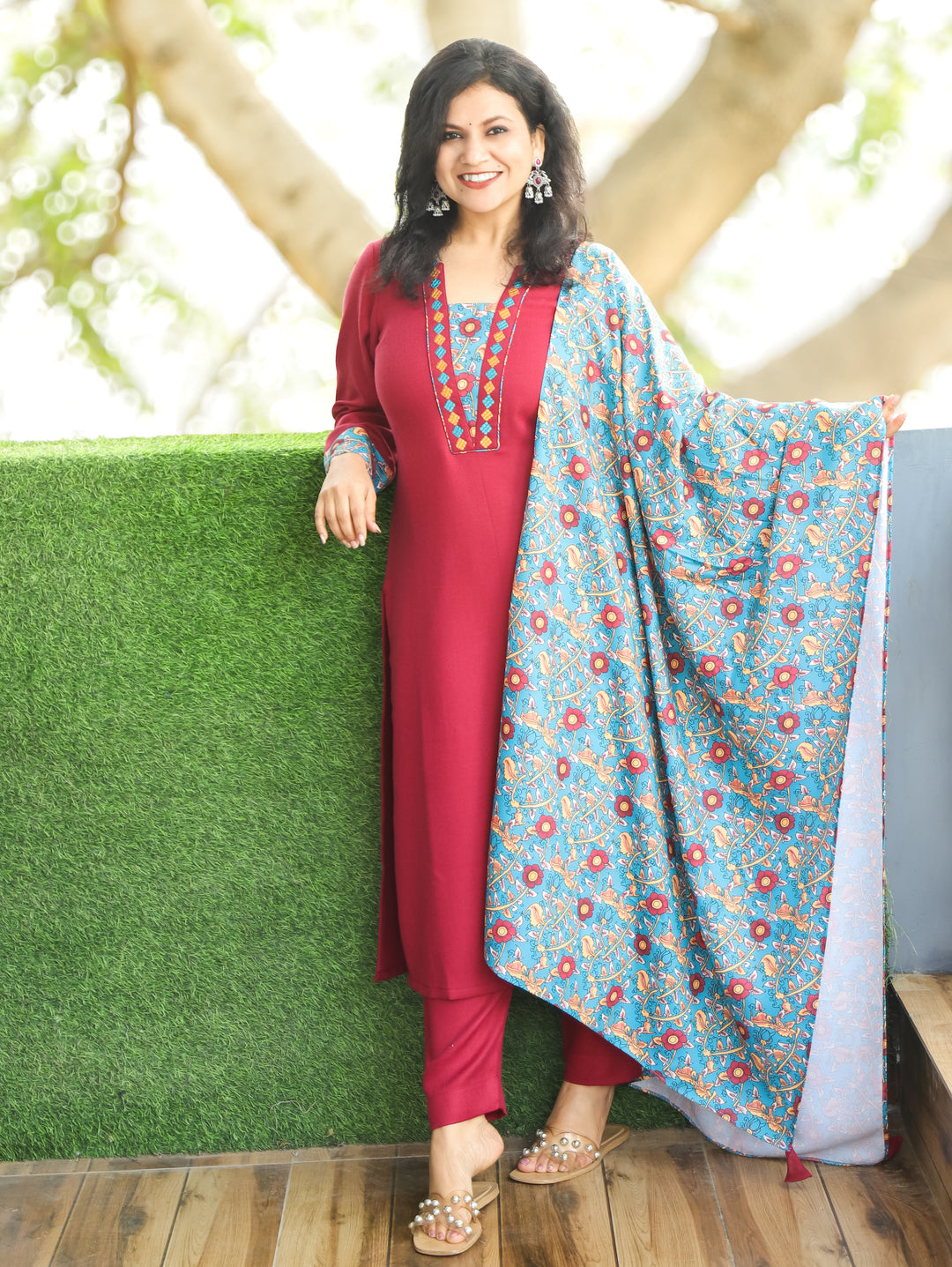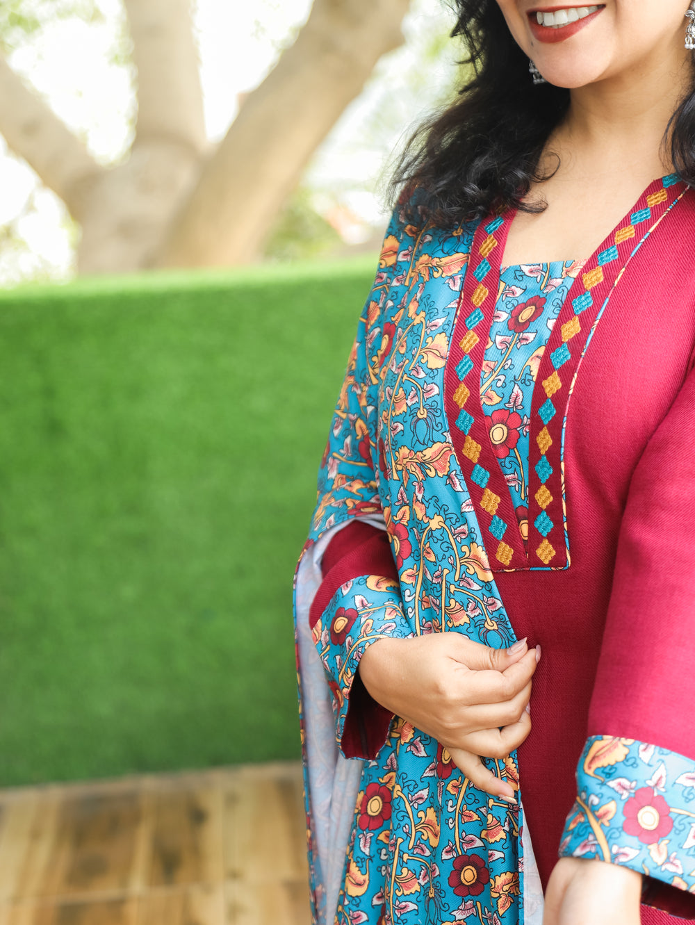 Tarang Maroon Wine Potli Button Work in Kanni Patch Neck Semi Pashmina Winter Kurti