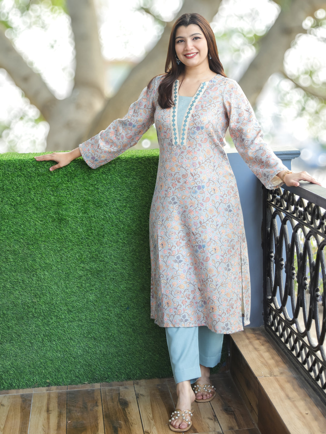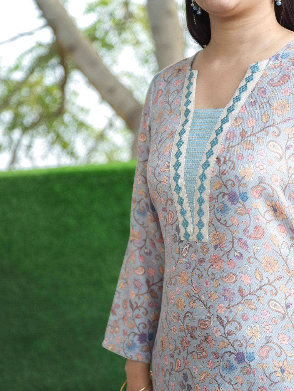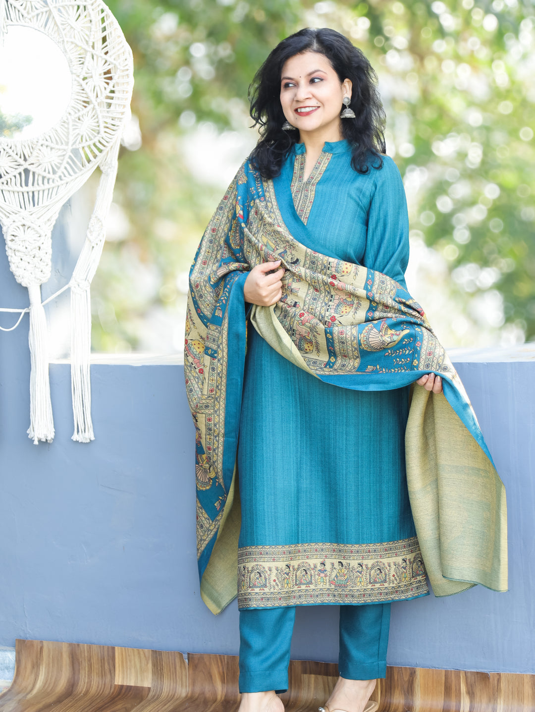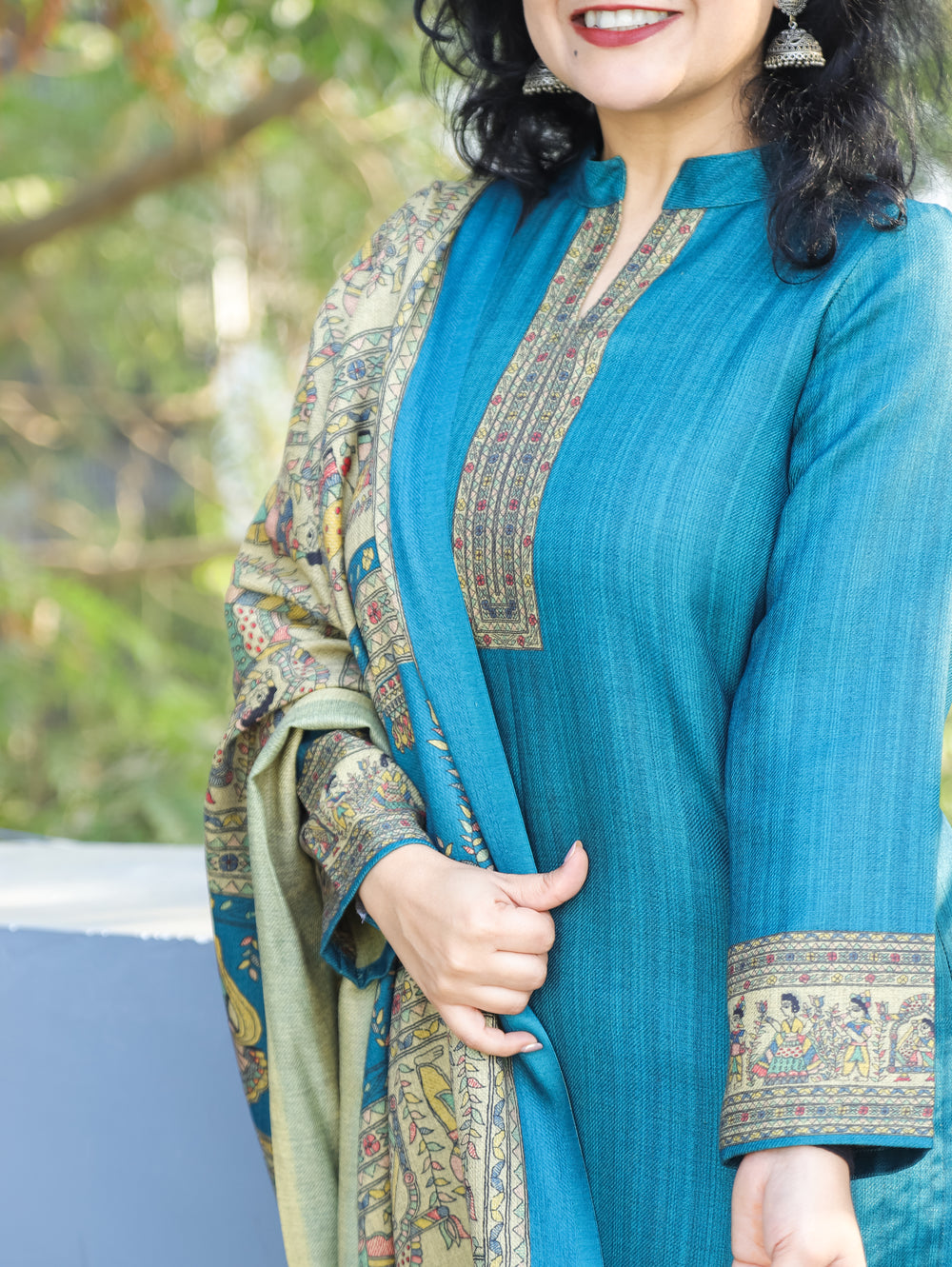 Sangini Blue Yoke with Thread and Ajrak Applique Patch Semi Pashmina Winter Kurti