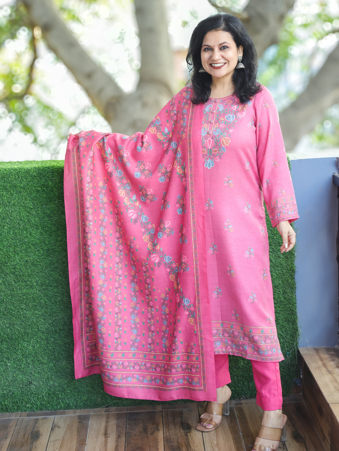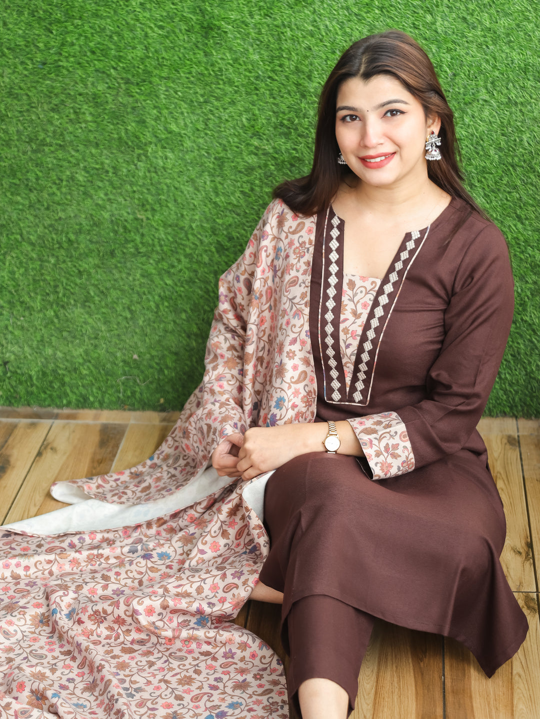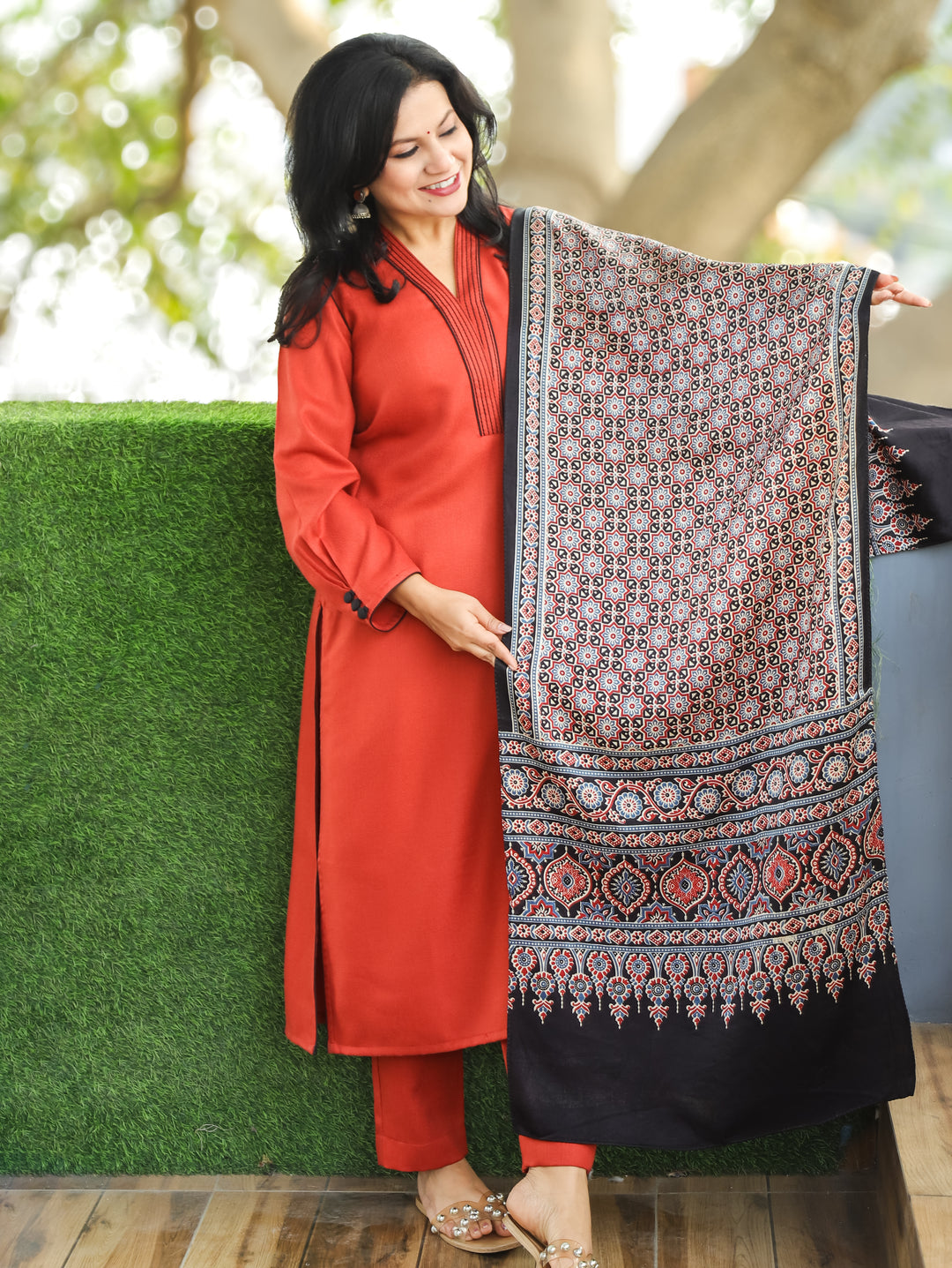 Parul Burnt Rust V Neck with Running Thread Work Semi Pashmina 3 Piece Set