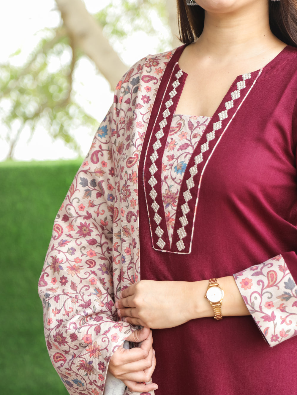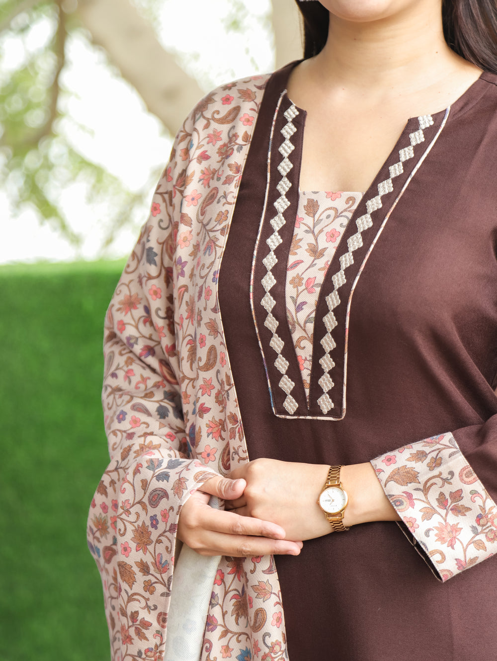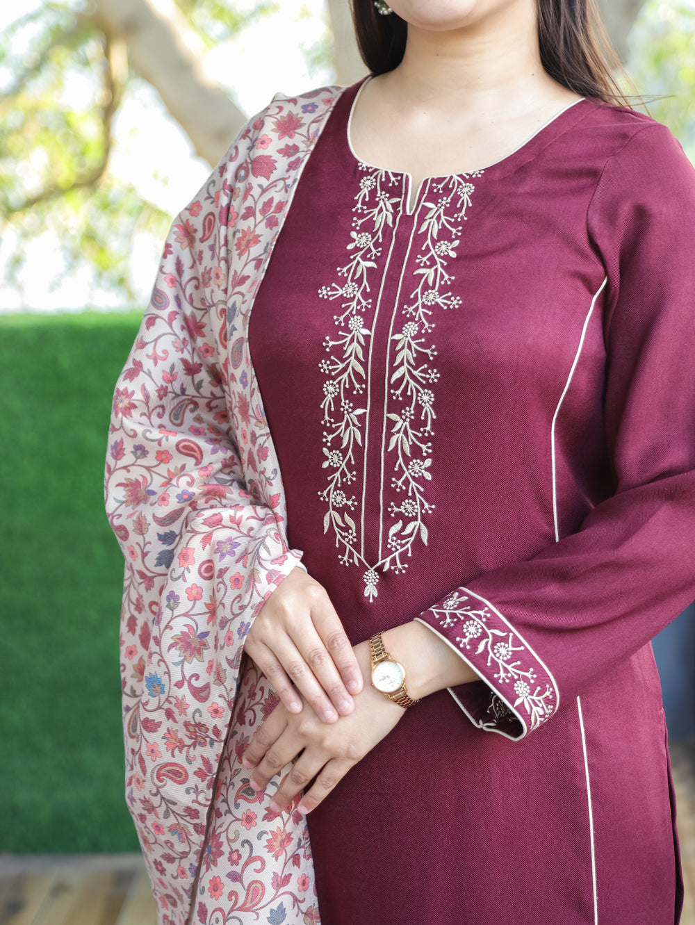 छाया Daisy Beige Thread Embroidered Neck Semi Pashmina Winter Kurti