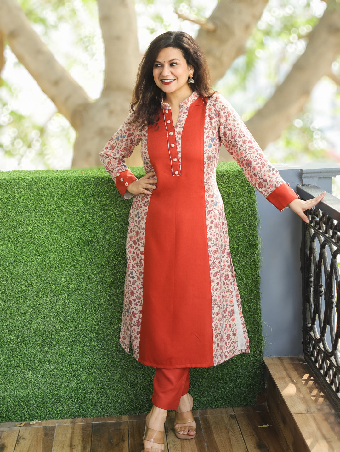 Khushi Rust Ban Collar Panel Kanni Print Button Work Semi Pashmina Winter Kurti