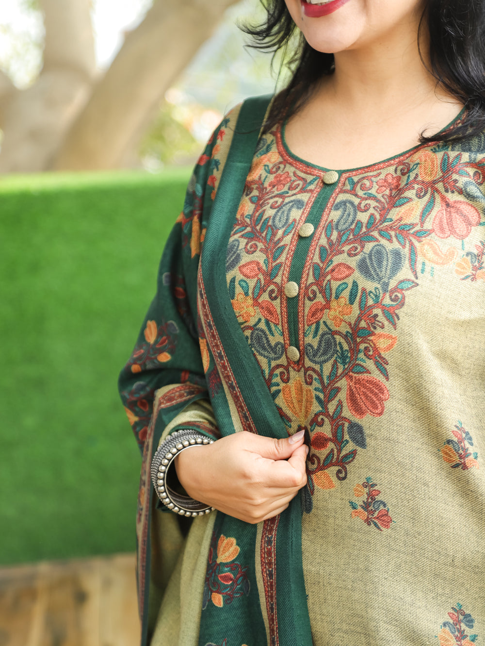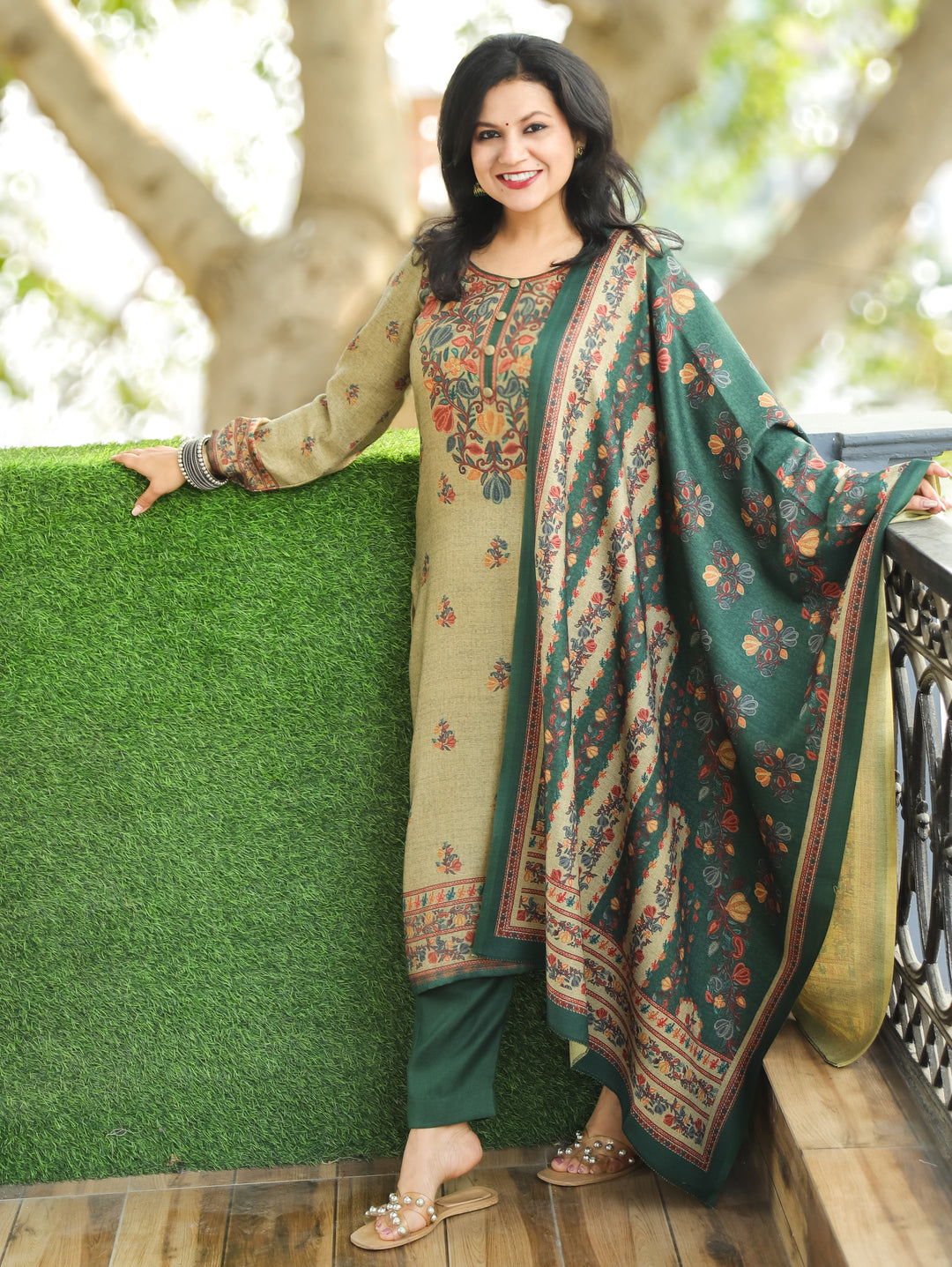 Rajori Beige with Green Round Neck Kashmiri Print Semi Pashmina 3 Piece Set