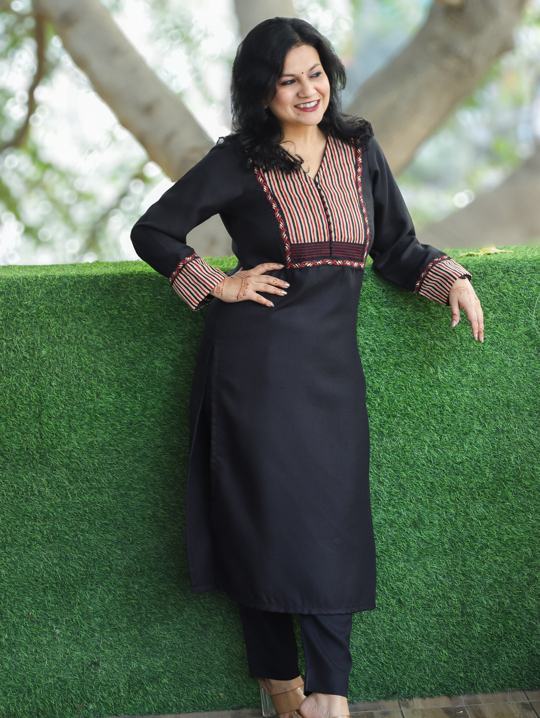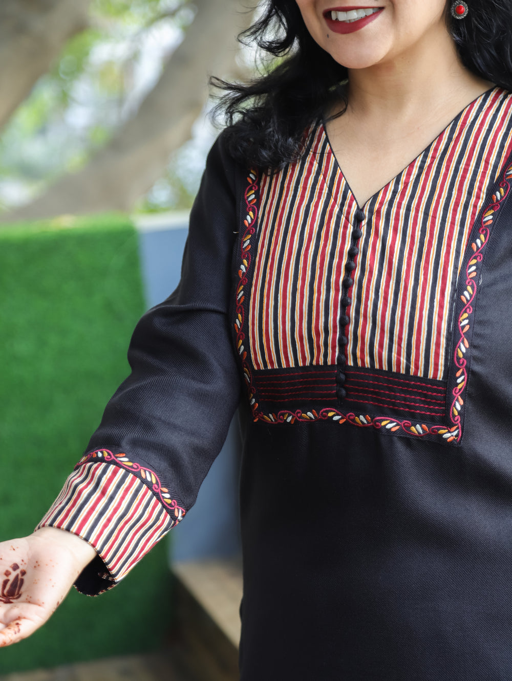 Pratiksha Black Potli Button Work in Stripe Patch Neck Semi Pashmina Winter Kurti