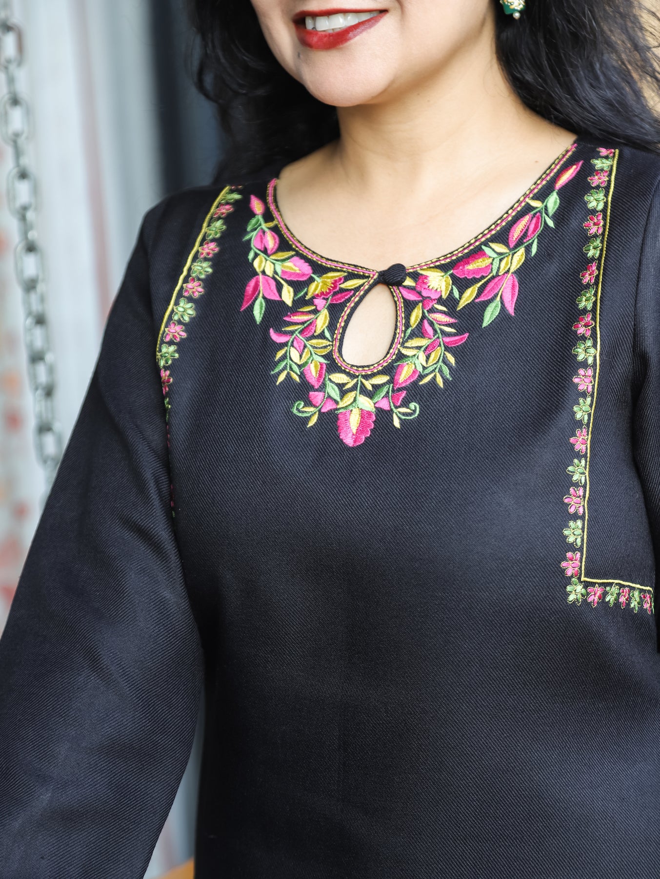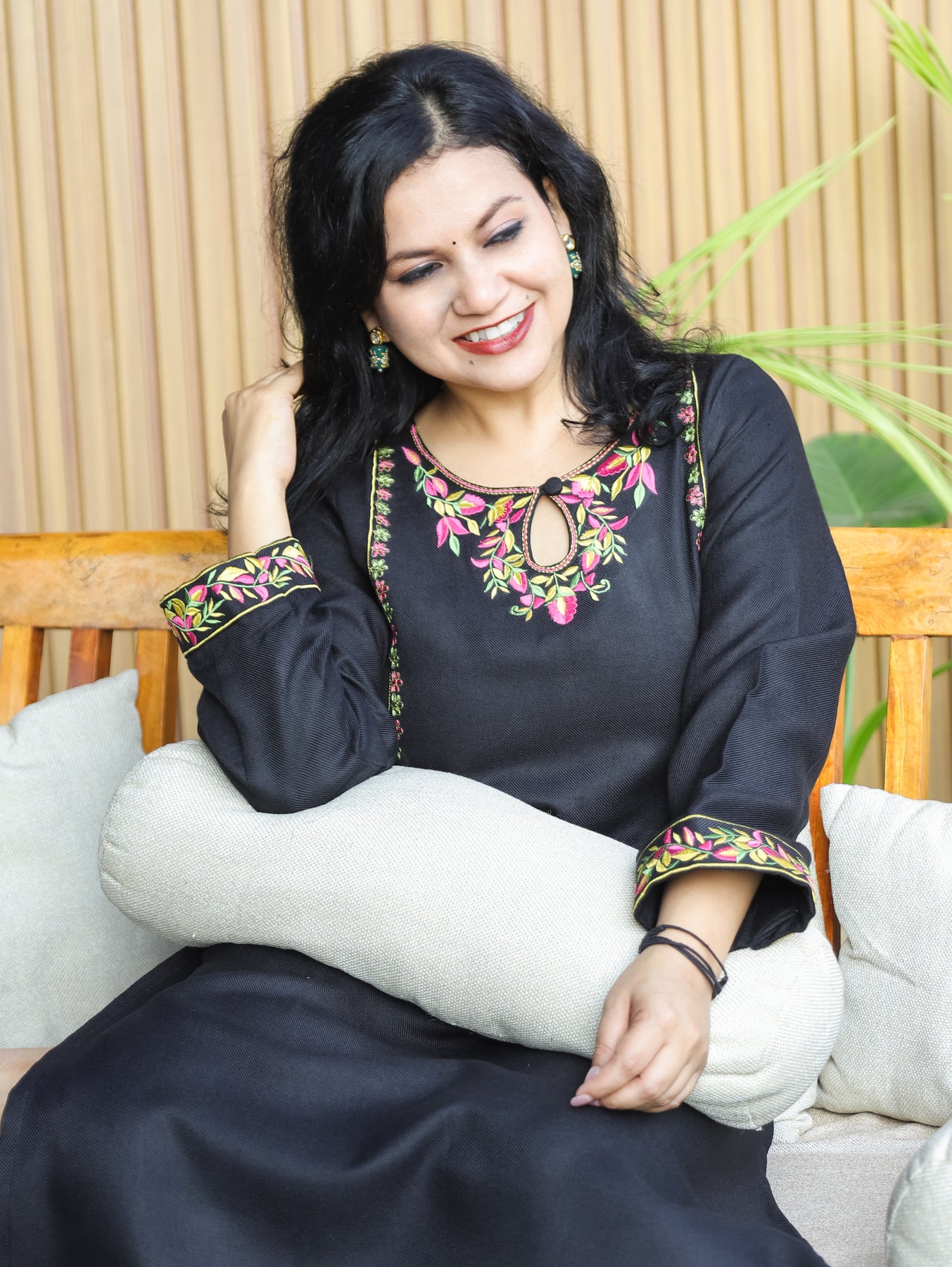छाया Ebony Black Embroidered Keyhole Neck Semi Pashmina Winter Kurti