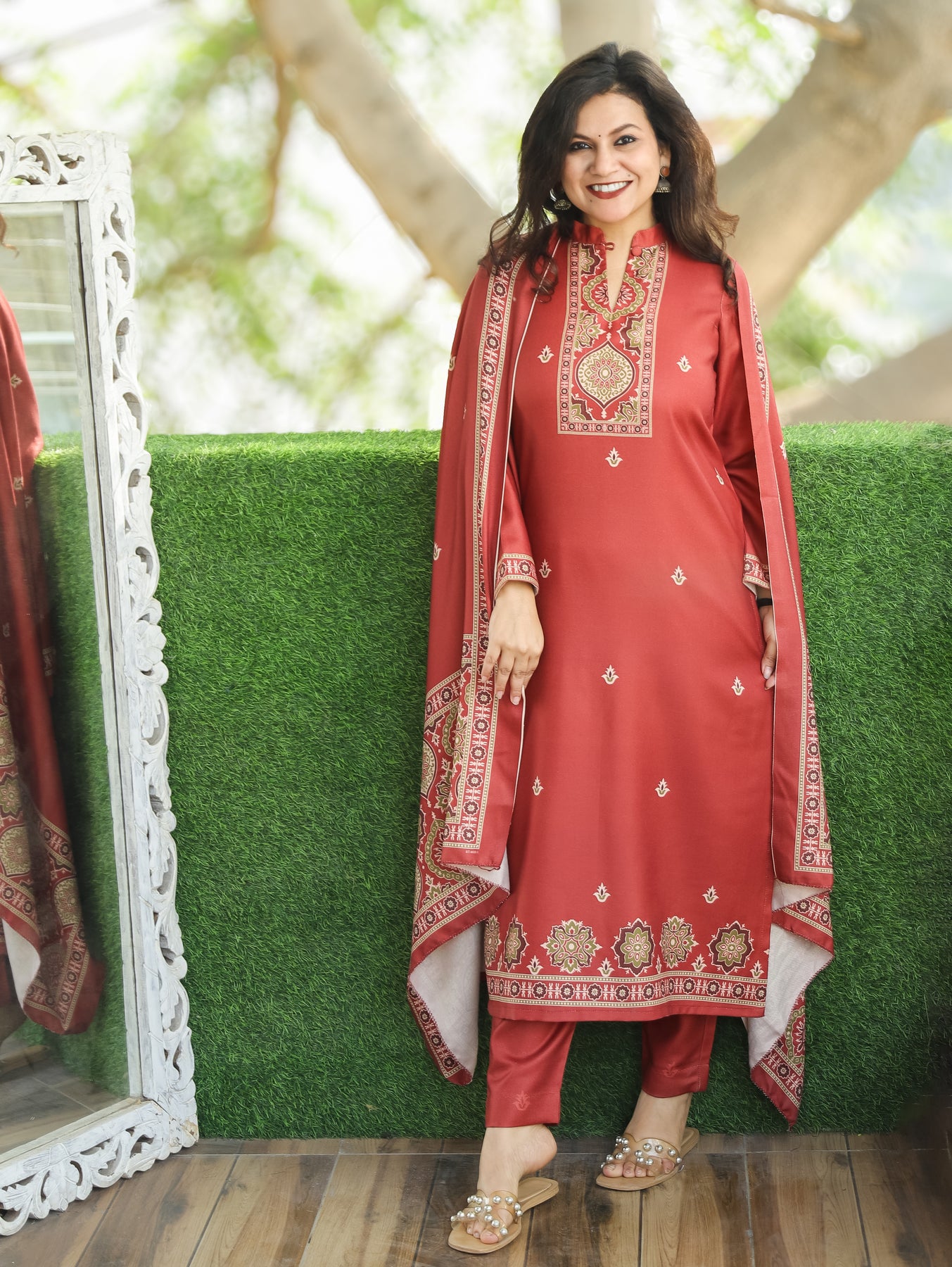 Trisha Rust Orange Ban Collar with Button Ajrak Print Semi Pashmina 3 Piece Set