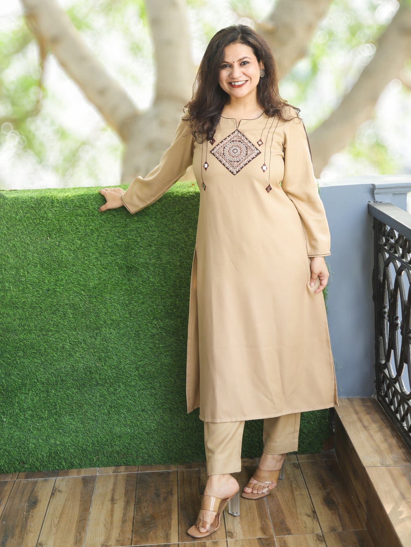 Ruchika Sand Beige Embroidered Patch Mirro Work Semi Pashmina Winter Kurti