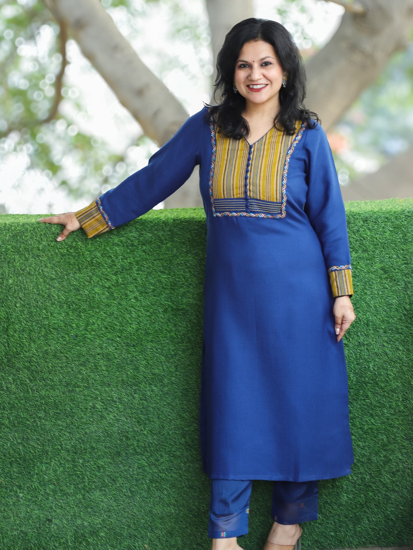 Pratiksha Blue Potli Button Work in Stripe Patch Neck Semi Pashmina Winter Kurti