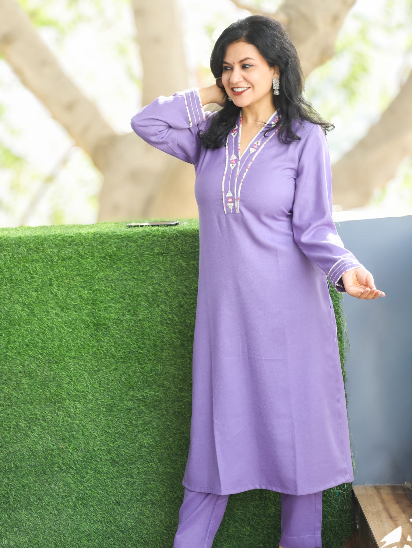 Priti Petal Lavender Semi Pashmina V-Neck Mirror Work Winter Kurti