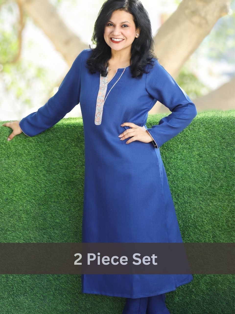 Saanchi Blue Round Neck Patch with Piping Semi Pashmina Winter 2 Piece Set