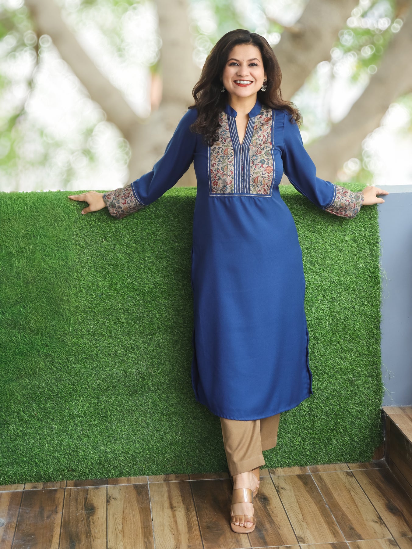 Kanakshi Marine Blue Running Stitch in Kanni Patch Neck Semi Pashmina Winter Kurti