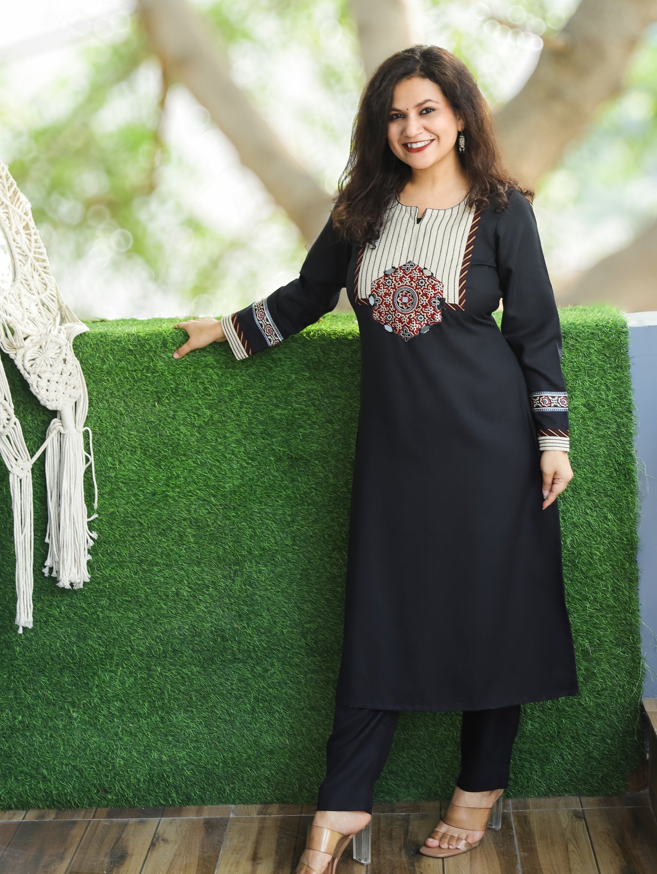 Sangini Black Yoke with Thread and Ajrak Applique Patch Semi Pashmina Winter Kurti