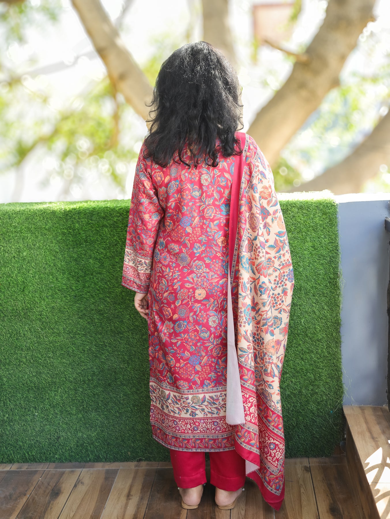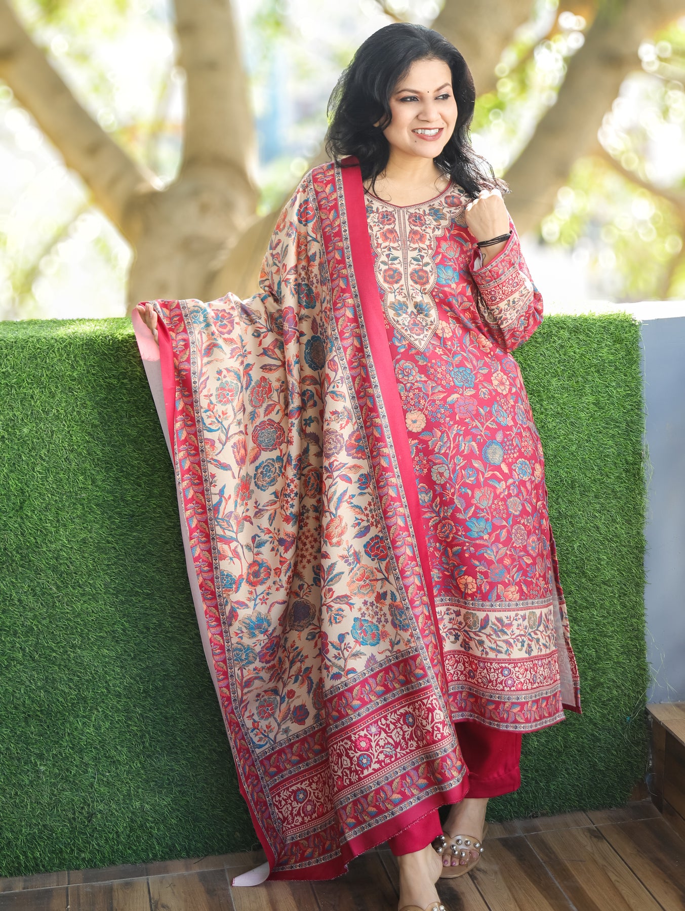 Tejaswi Bright Pink Round Neck Kashmiri Floral Print Semi Pashmina 3 Piece Set