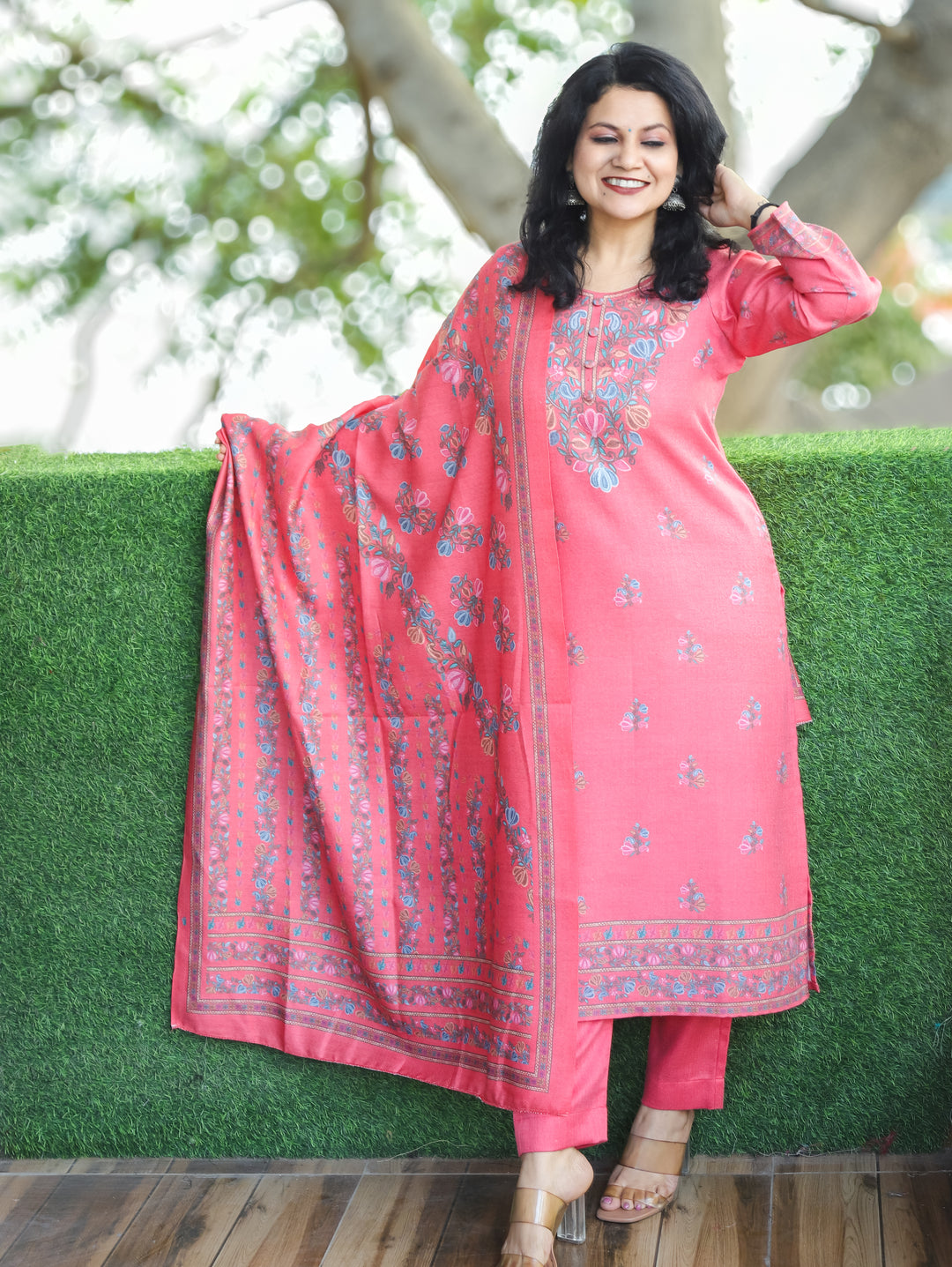 Saloni Coral Blush Round Button Neck Digital Kashida Print Semi Pashmina 3 Piece Set
