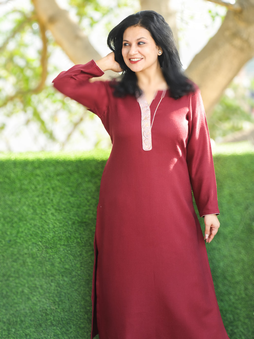 Khushi Wine Red Ban Collar Panel Kanni Print Button Work Semi Pashmina Winter Kurti