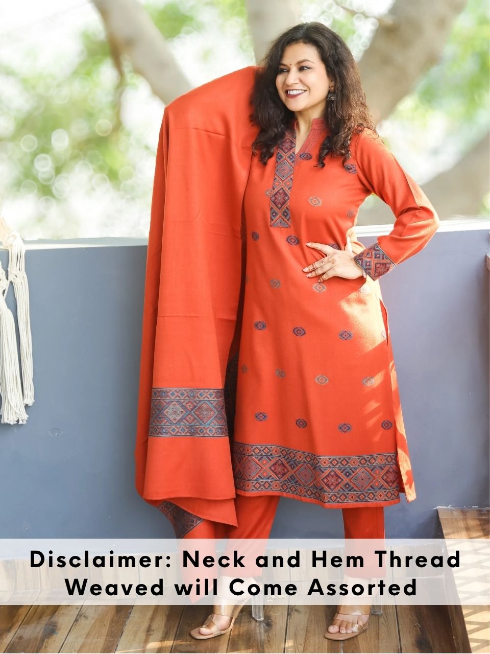 श्रीजा Rust Orange Ban Collar Kullu Thread Weaved Semi Pashmina Winter 3 Piece Set
