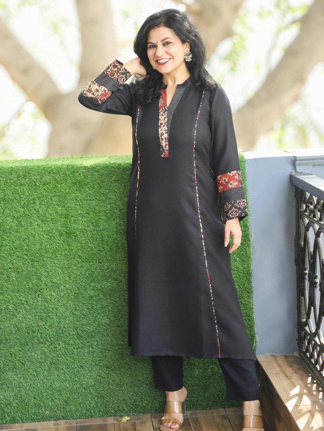 Anvika Ebony Black Ban Collar Panel Kantha Work Patch Semi Pashmina Winter Kurti