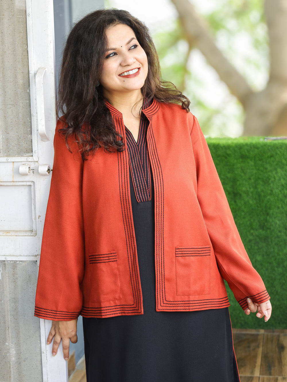 Sejal Rust Orange Ban Collar Running Stitch Semi Pashmina Jacket with Pocket