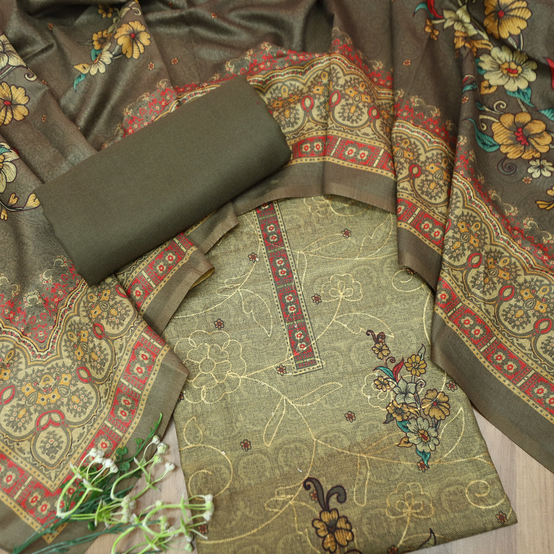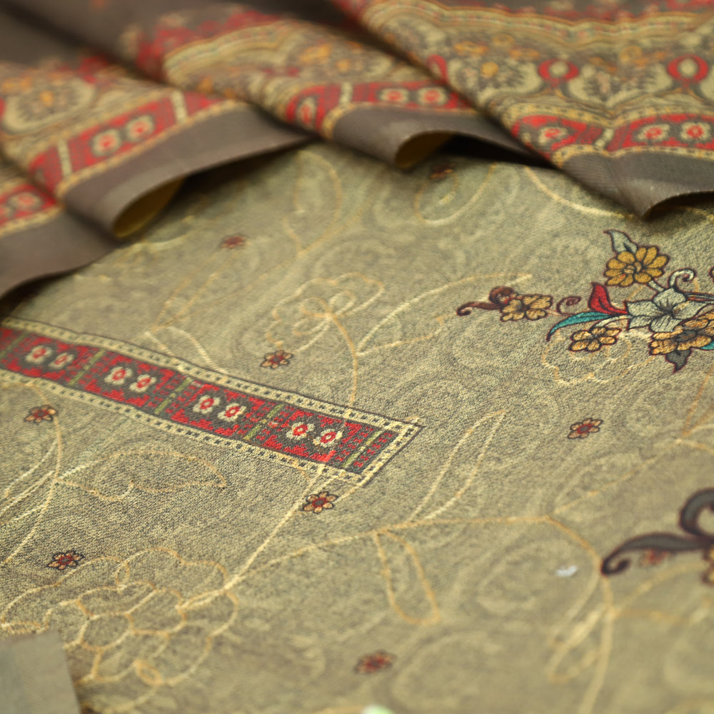 गुलकंद Olive Tan Floral Print Hemline with Thread Weaved Semi Pashmina Winter Set
