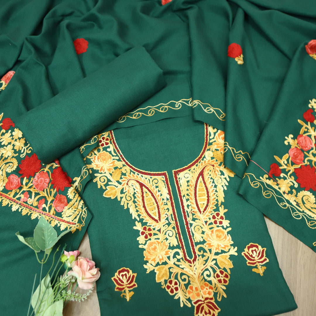 भानु Dark Green with Elegant All Over Embroidery Work Semi Pashmina winter Set