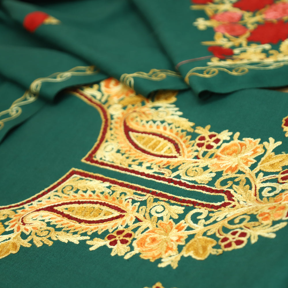कनक Dark Green Kashida Embroidery Work Semi Pashmina Winter Set