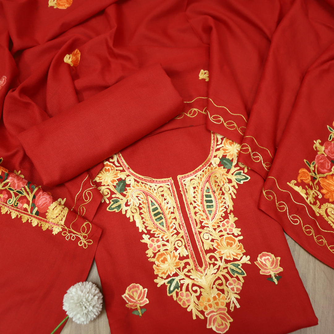 योगिनी Bride Red Woven with Kashida Embroidery Semi Pashmina Winter Set