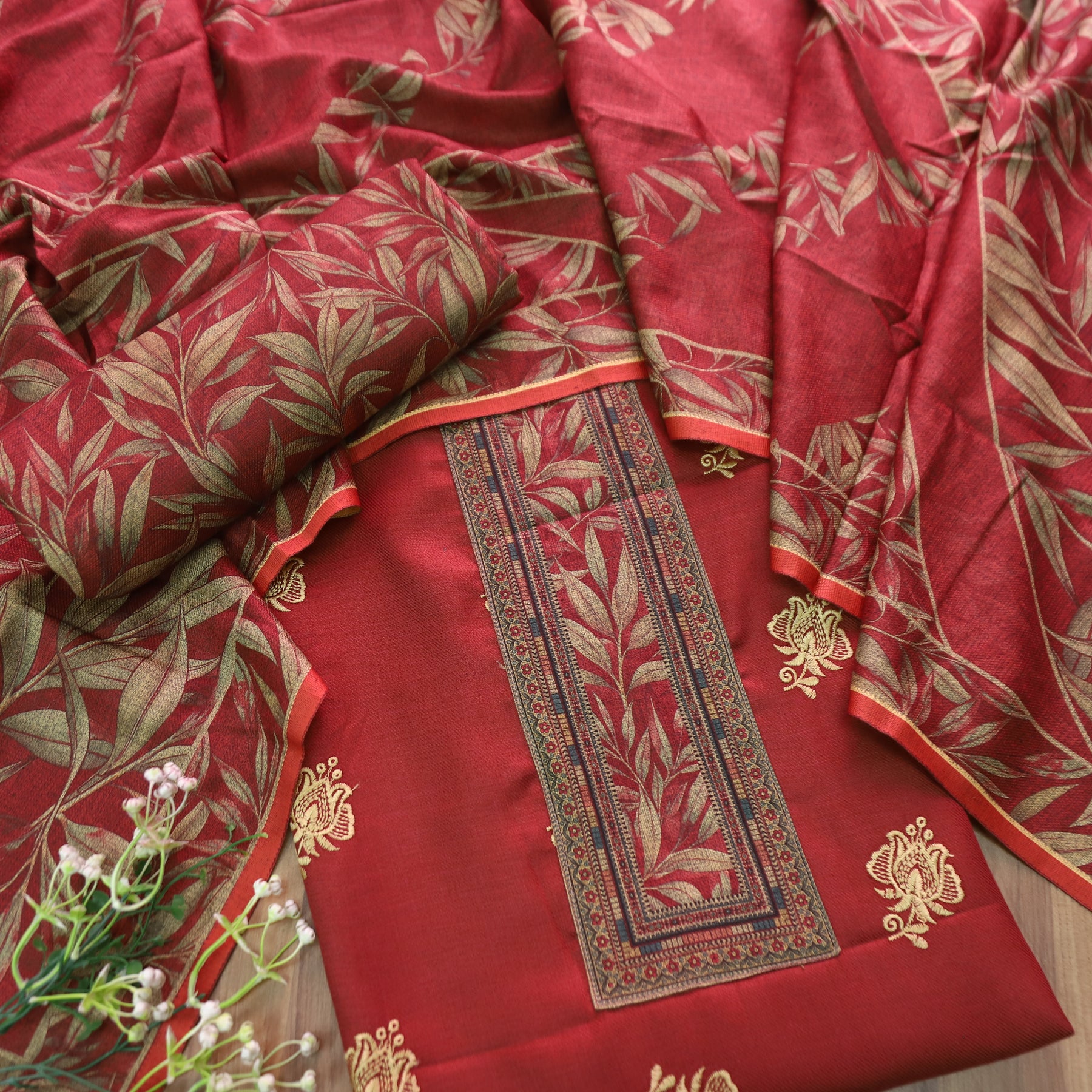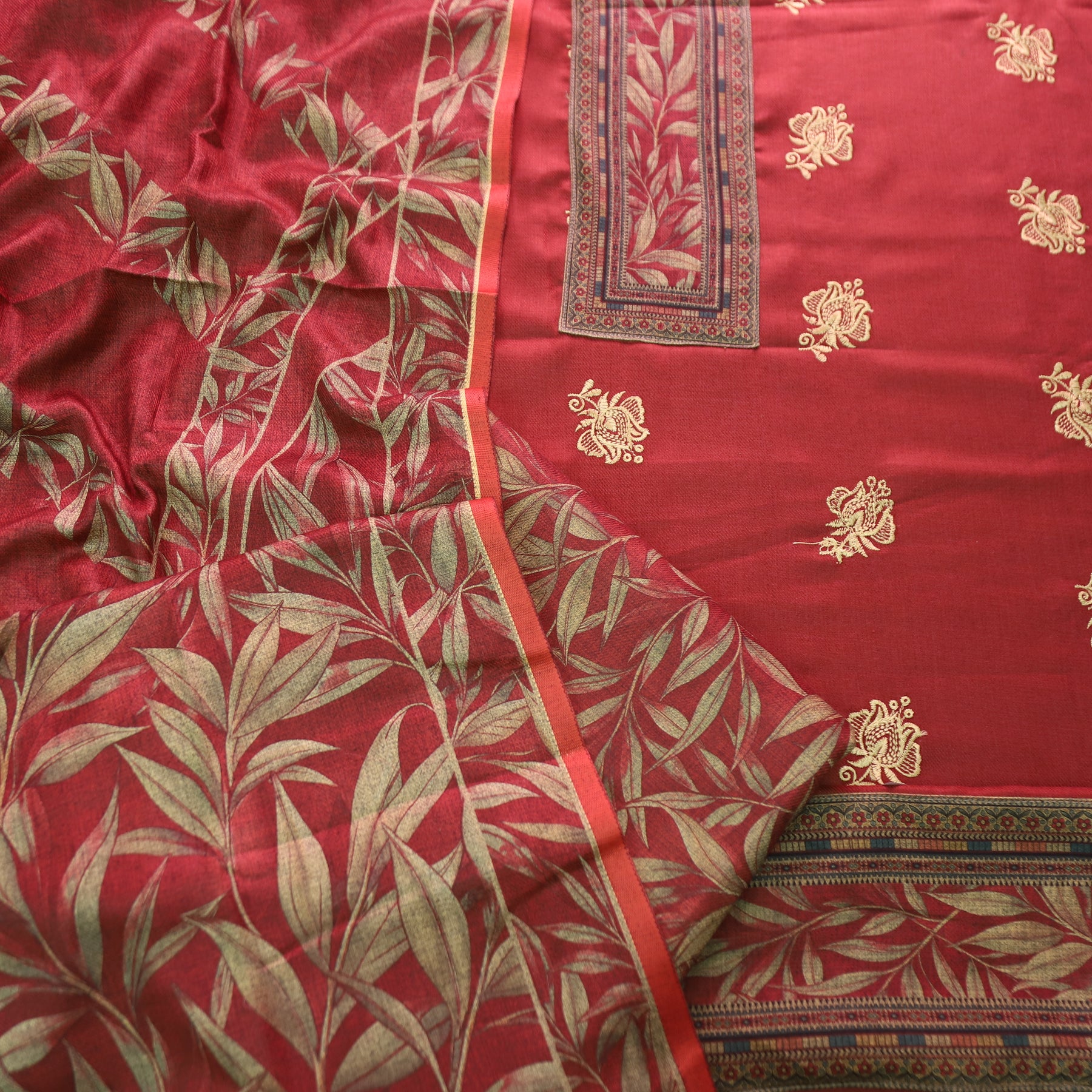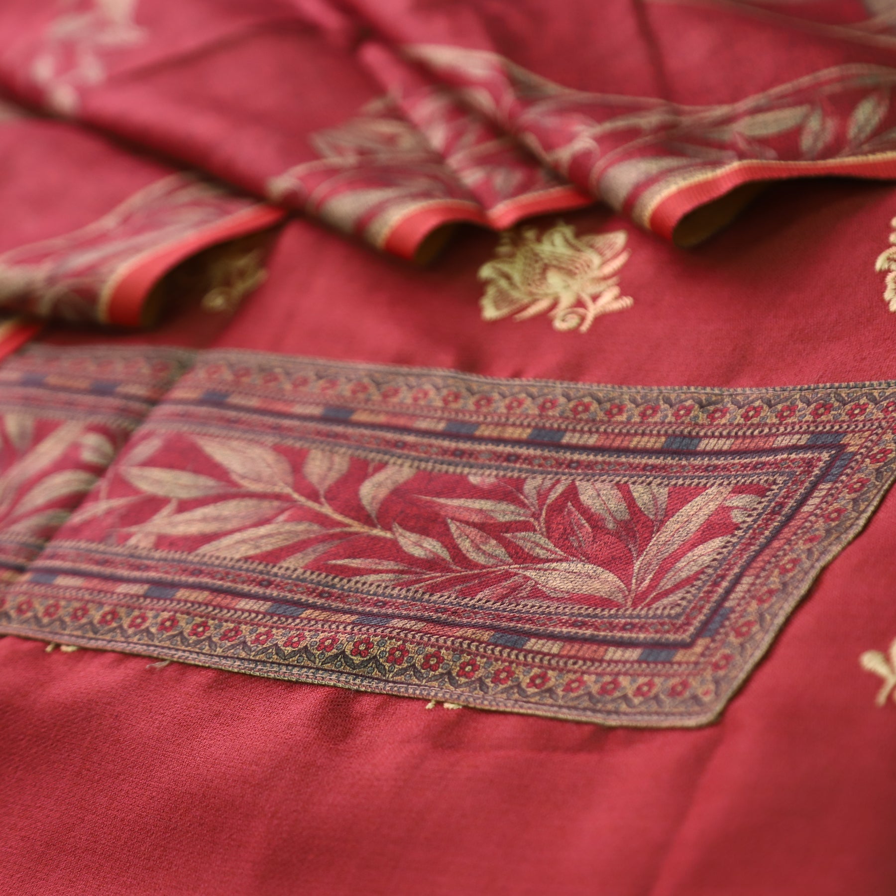 अंजना Mahogany Red Floral Print in Floral Embroidery Work Semi Pashmina Winter Set