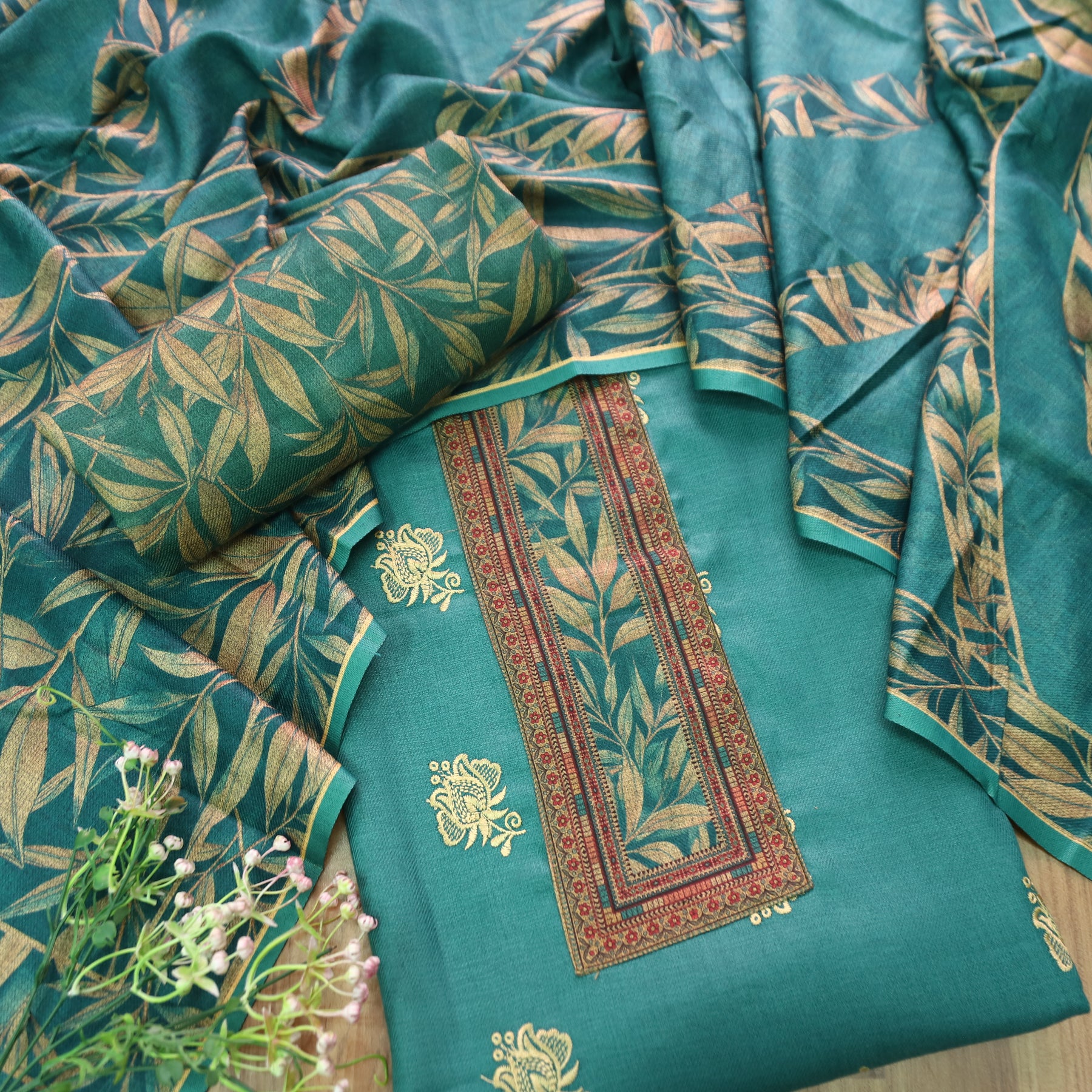 अंजना Teal Green Floral Print in Floral Embroidery Work Semi Pashmina Winter Set
