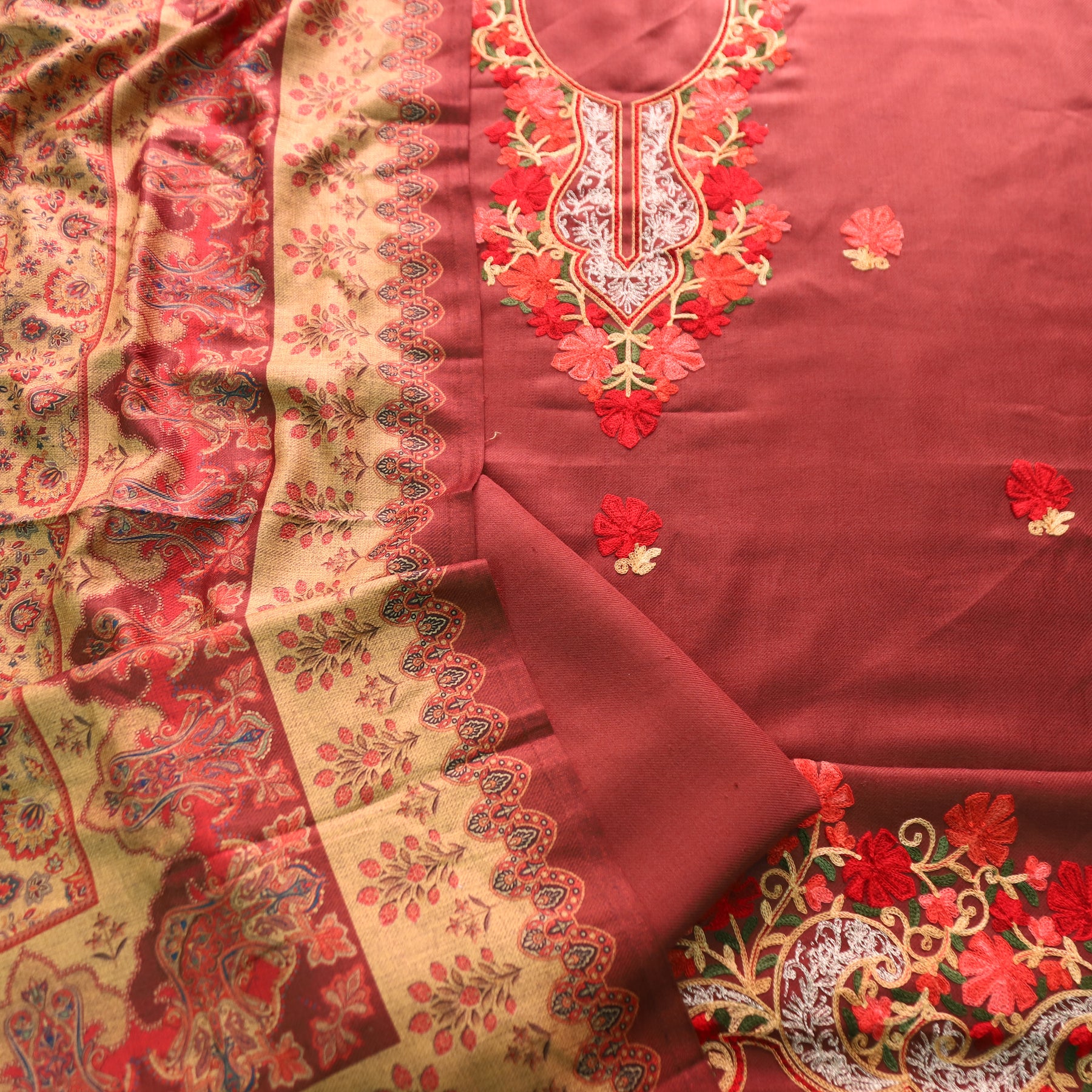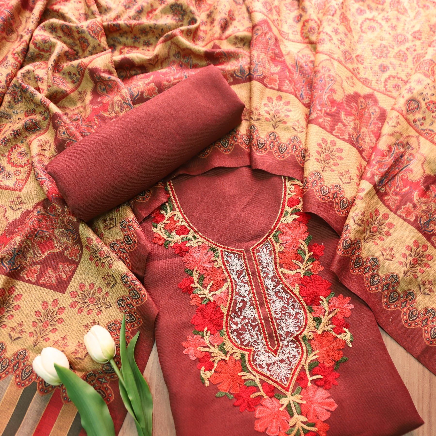 कनक Barn Maroon Kashida Embroidery Work Semi Pashmina Winter Set