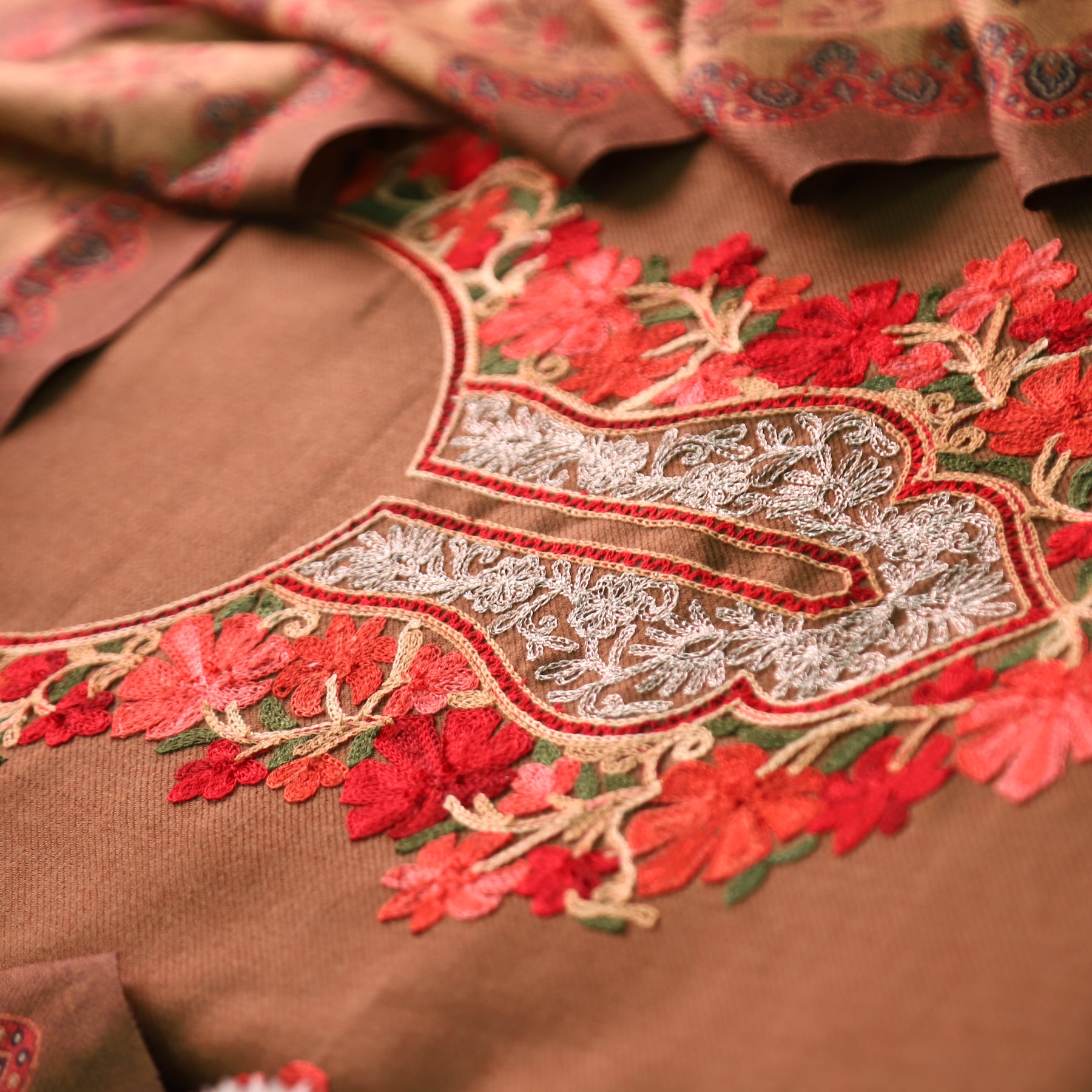 Work- Step into refined winter elegance with this semi pashmina suit set, defined with intricate Kashida embroidery spread beautifully across the top. The delicate threadwork adds a handcrafted charm to the soft, warm fabric, making it perfect for the season. Paired with a plain bottom for balanced simplicity and a Kanni-inspired printed dupatta