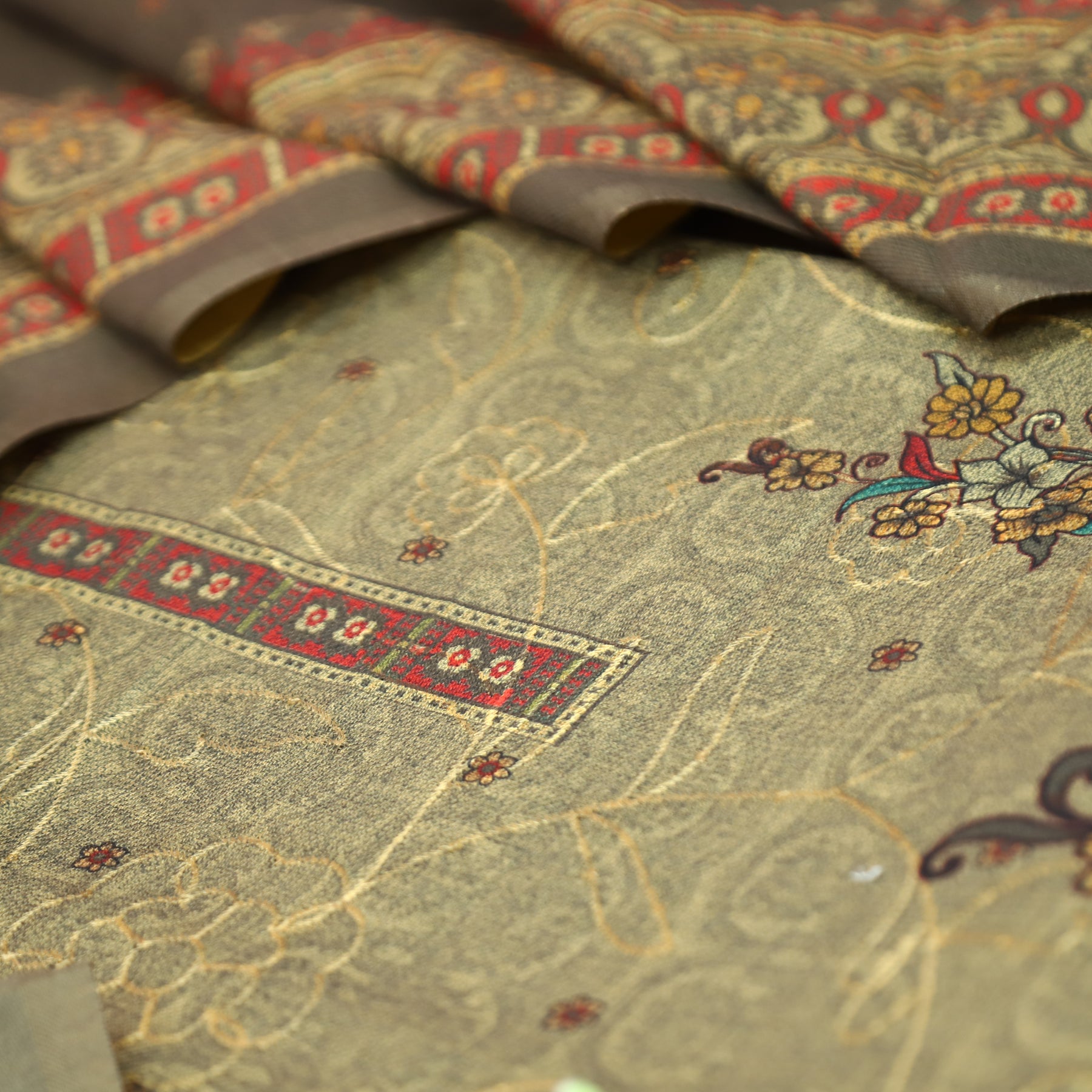 गुलकंद Olive Tan Floral Print Hemline with Thread Weaved Semi Pashmina Winter Set