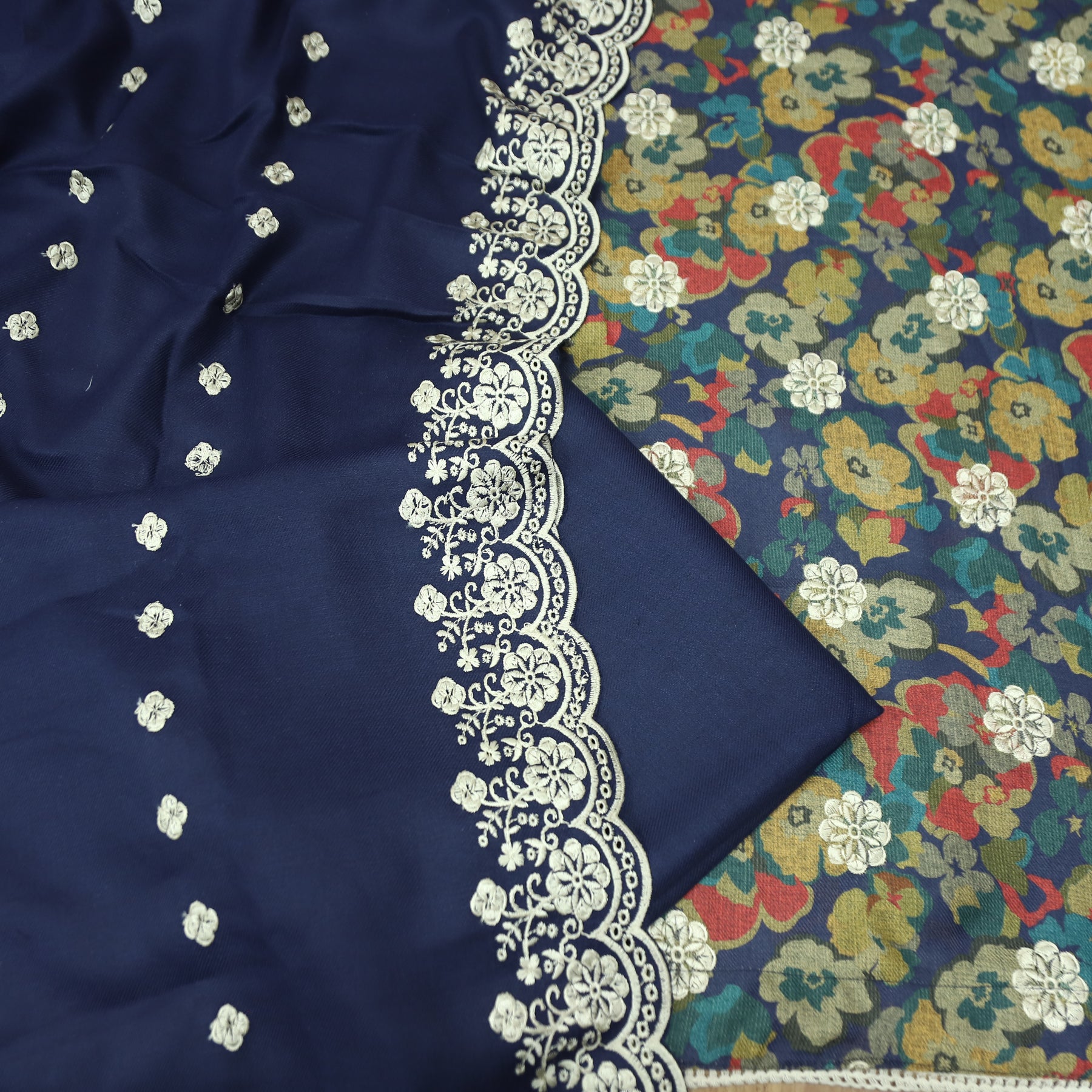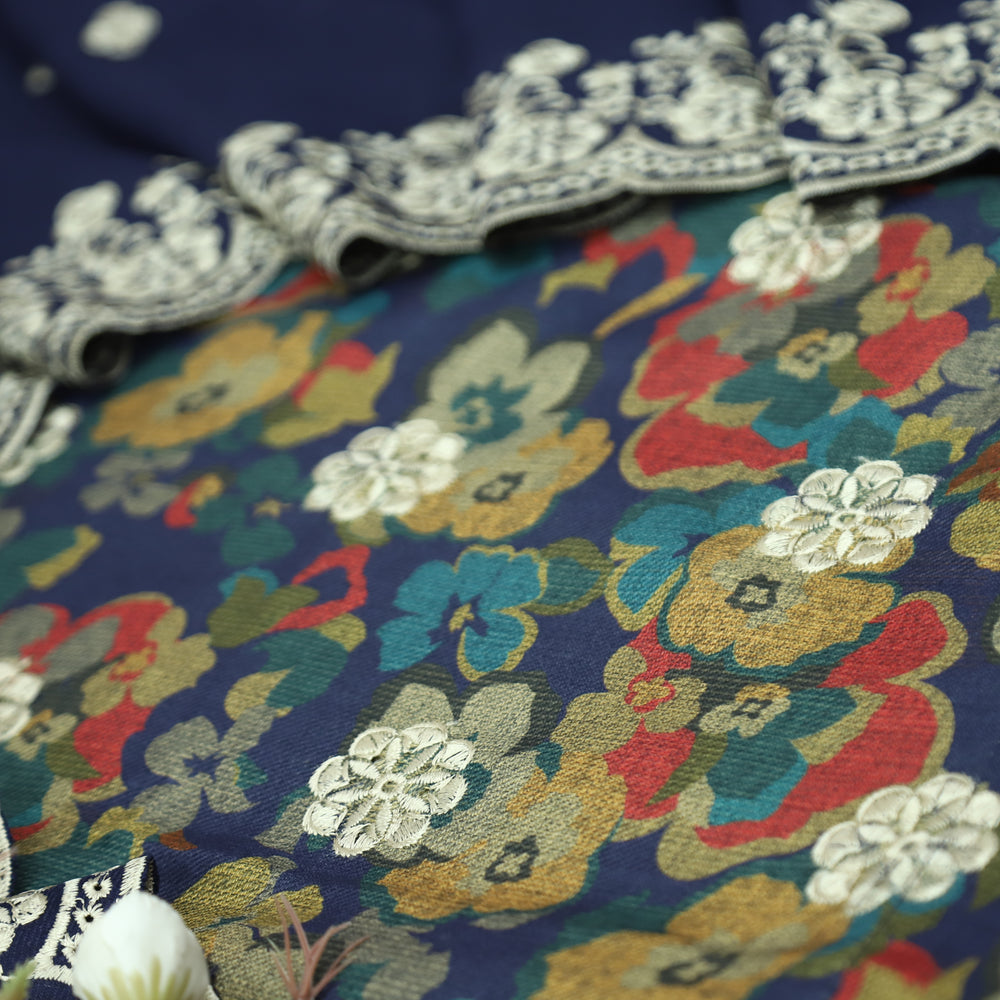 झुमकी Navy Blue Floral Printed in Embroidered Work Semi Pashmina Winter Set